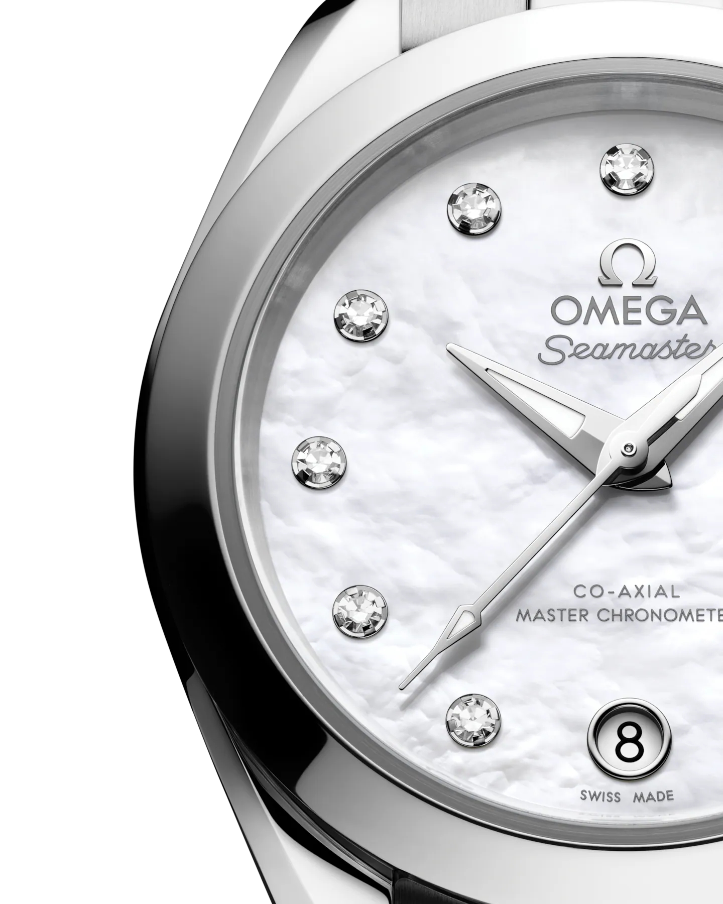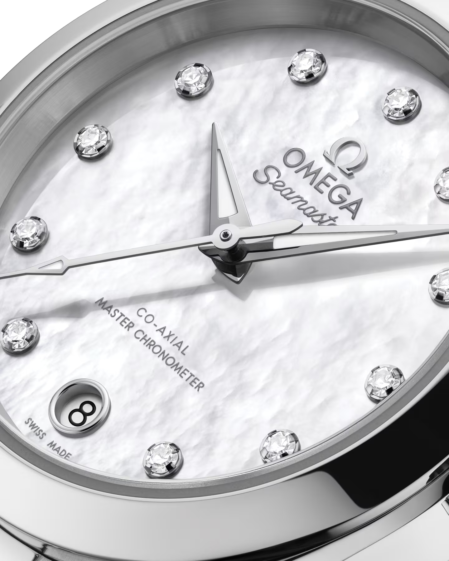 全体に光沢のある仕上げが施されたホワイト マザーオブパールのダイアルは、6時位置に丸型の日付窓を備えます。11個のダイヤモンドのインデックスと面取りを施し新たにデザインされた針を配し、分針は先に行くにつれ細くなる繊細な形状に仕上がっています。アプライドのディテールと針はすべて18Kホワイトゴールド製で、針にはブルーの光を放つホワイトのスーパールミノヴァを塗布しています。