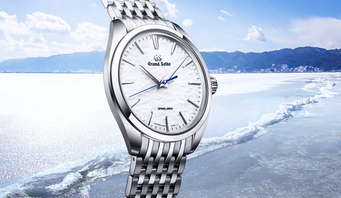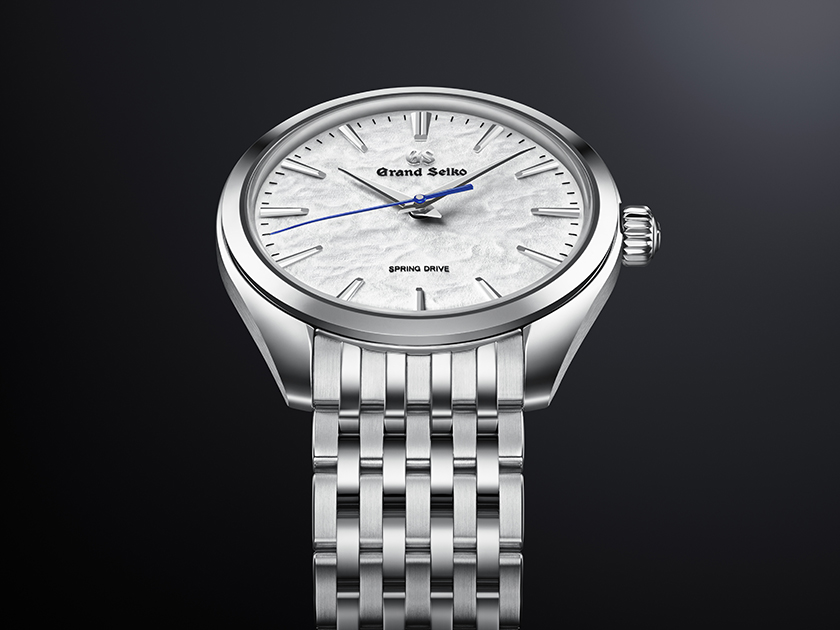 「白銀の御神渡り」をテーマにした本モデル は、太陽の光を反射し繊細な輝きを放つ結氷を想起するようなダイヤルが特徴です。張りのあるカーブフォルムが特徴の薄型ドレスデザインにふさわしい細やかな九列のブレスレットが腕の動きに沿って、繊細な輝きを放ちます。ムーブメントは、セイコーエプソン塩尻事業所にある「信州 時の匠工房」で作られ、約72時間の持続時間を持つ手巻スプリングドライブキャリバー「9R31」を搭載。薄く長い2本の動力ぜんまいを並列に重ねるデュアル・スプリング・バレルを採用しています。また、ヘアライン仕上げの美しいムーブメントの外観も特徴です。