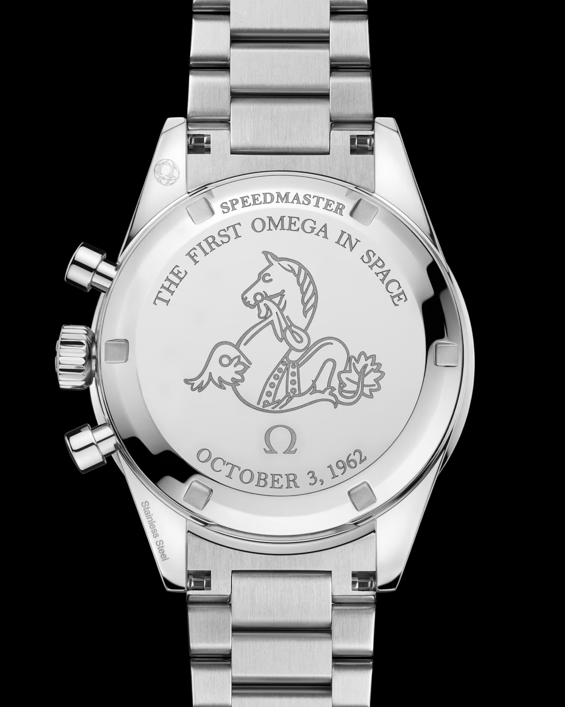 ダイアルとリュウズにはヴィンテージのオメガ ロゴがあしらわれ、ケースバックには有名なシーホースのメダリオン、そして“THE FIRST OMEGA IN SPACE”、“OCTOBER 3, 1962”の文字のエングレービングが施されています。