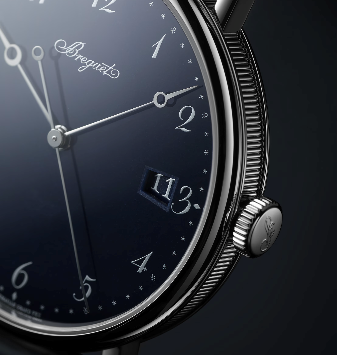 この独特のカラーは、現代的な印象を放ちながらブレゲのエレガントでシンプルな美しいスタイルを引き立てています。