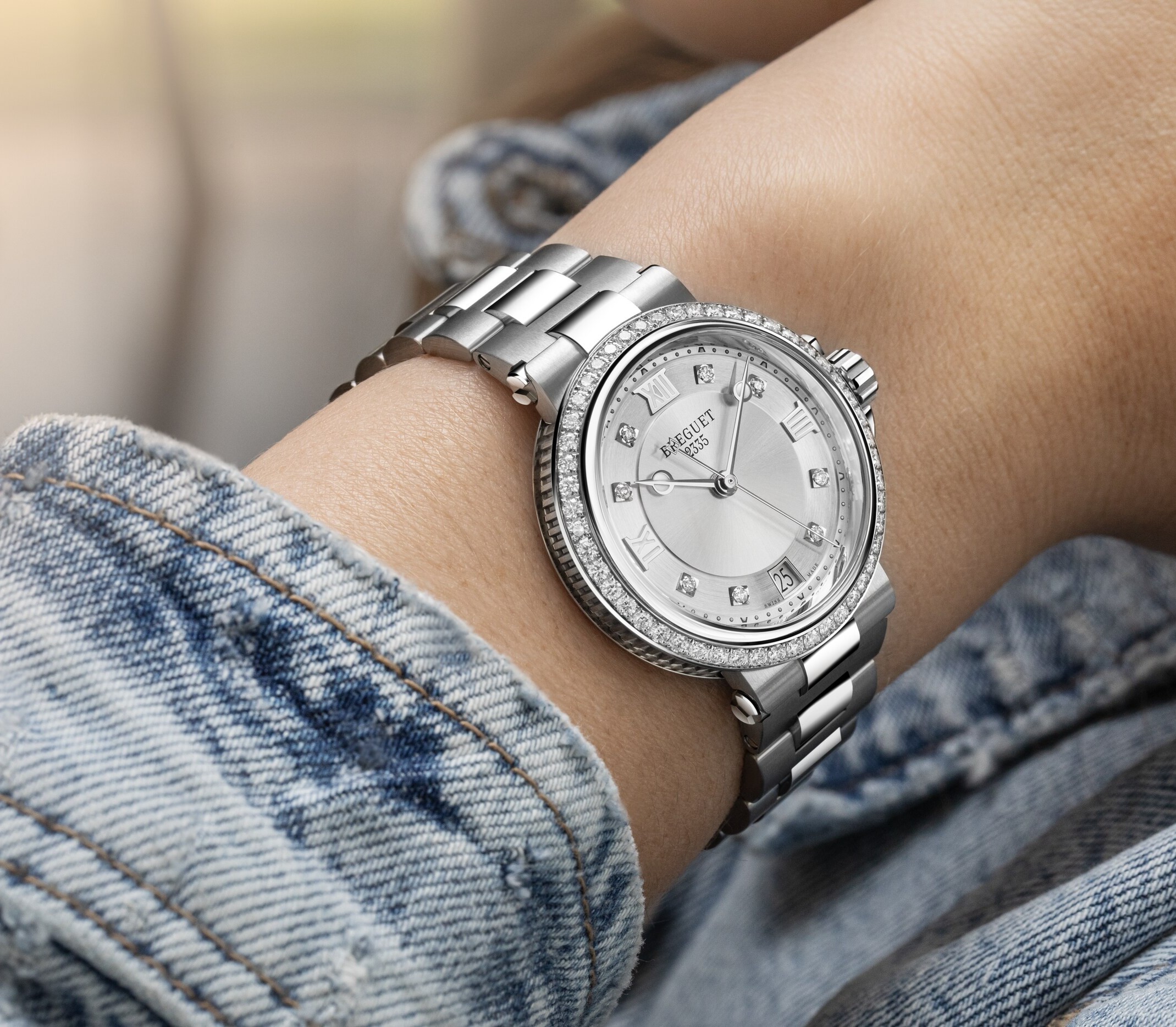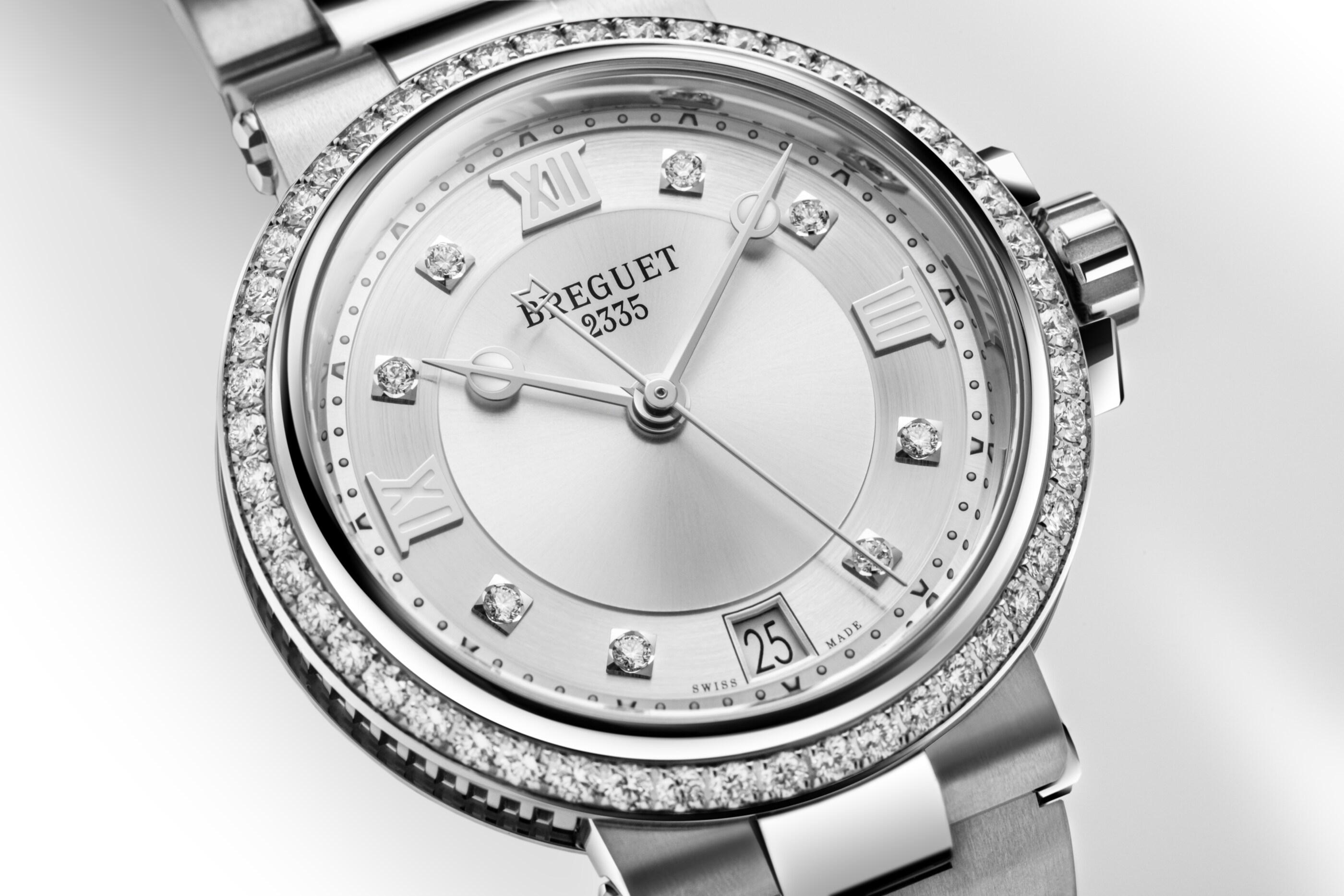 爽やかなシルバーカラーに、文字盤とベゼルを彩るブリリアントカットダイヤモンドが優美に輝きます。