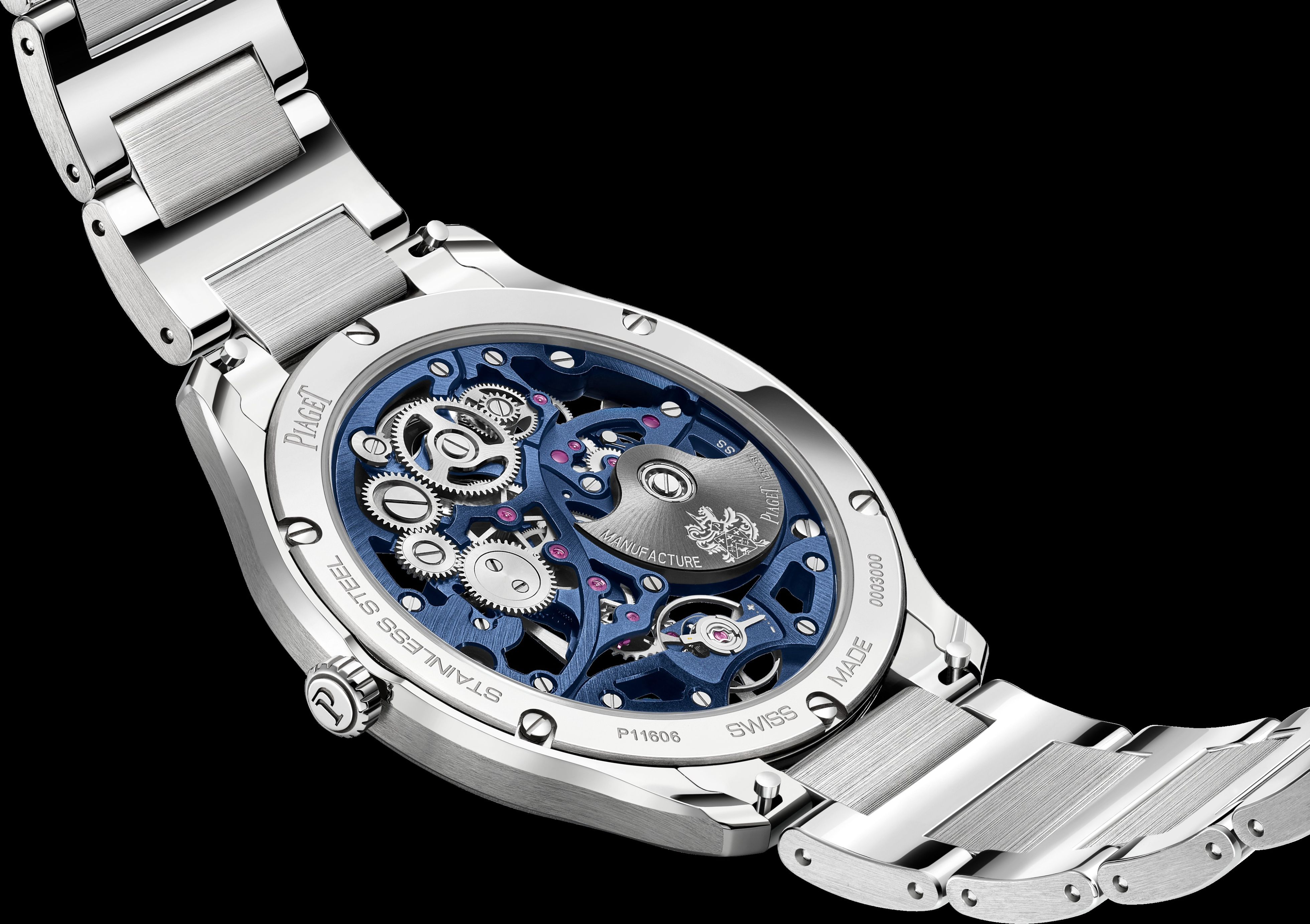 Piaget Polo Skeleton、42mm。ステンレススチール製ケース。セカンドストラップ付き。サファイアクリスタルケースバック。ブルーの1200S1自社製薄型自動巻ムーブメント。