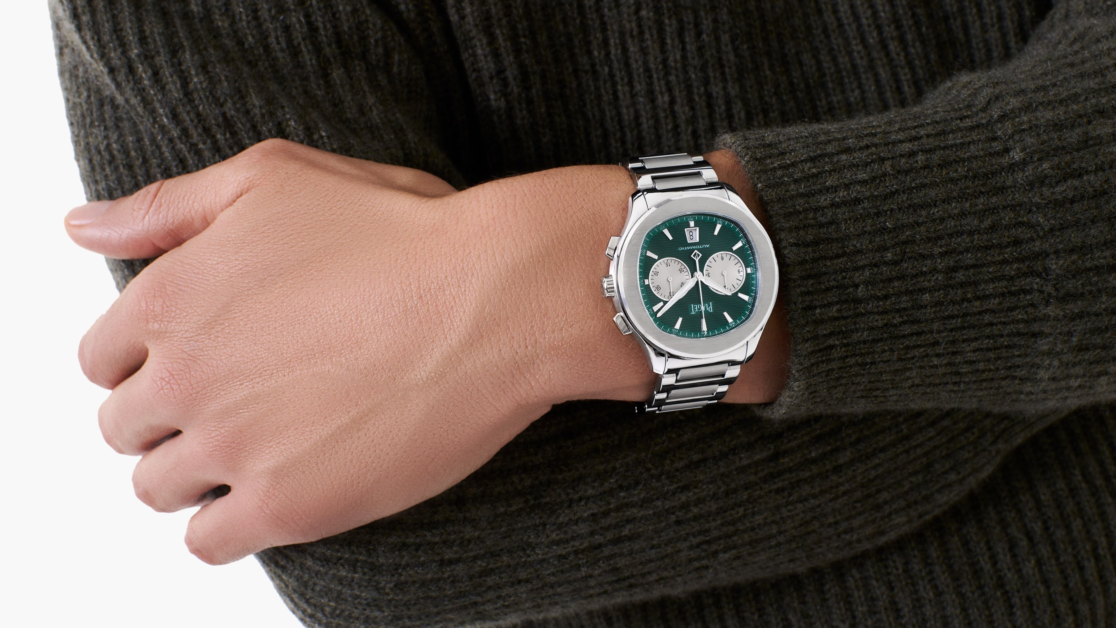 Piaget Polo クロノグラフ、42mm、ステンレススチール製ケース、グリーン文字盤、スーパールミノバ®加工されたカウンターとインデックス、サファイアケースバック、1160P自社製自動巻ムーブメント クロノグラフ、日付表示