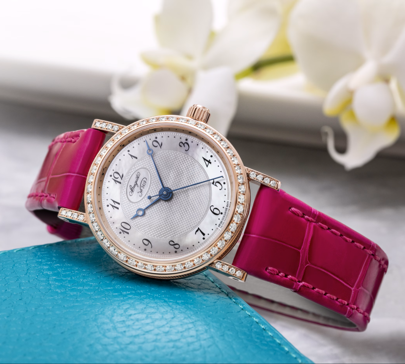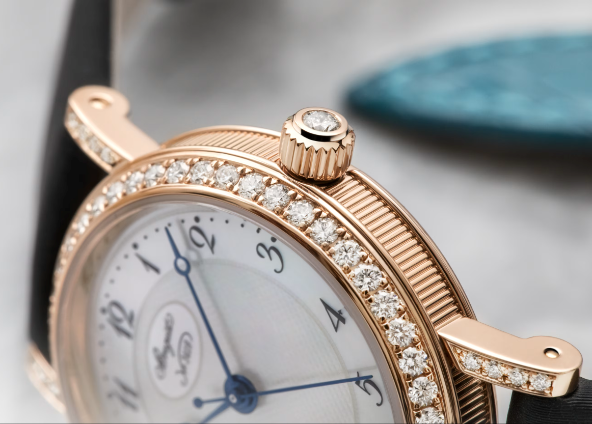 緻密なディテールのうちのひとつであるリュウズにはダイヤモンドカボション1個がセットされています。ケースは64個のブリリアントカット・ダイヤモンドがあしらわれたベゼルとラグを備えています。マザーオブパールダイヤルは緻密なギヨシェ彫りで装飾され、ブレゲ数字をあしらったチャプターリングで彩られています。