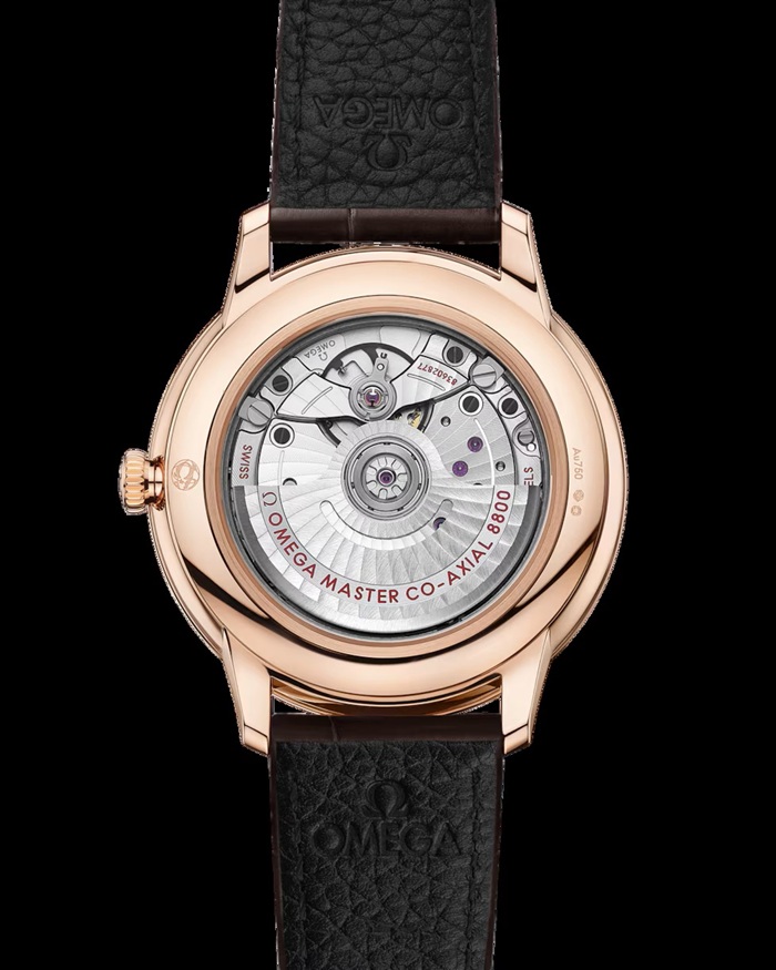 マスター クロノメーター認定を取得したこの時計は、ブラウンのレザーストラップを備え、傷の付きにくいサファイアクリスタル製ケースバックからオメガ マスター コーアクシャル キャリバー8800を眺めることができます。