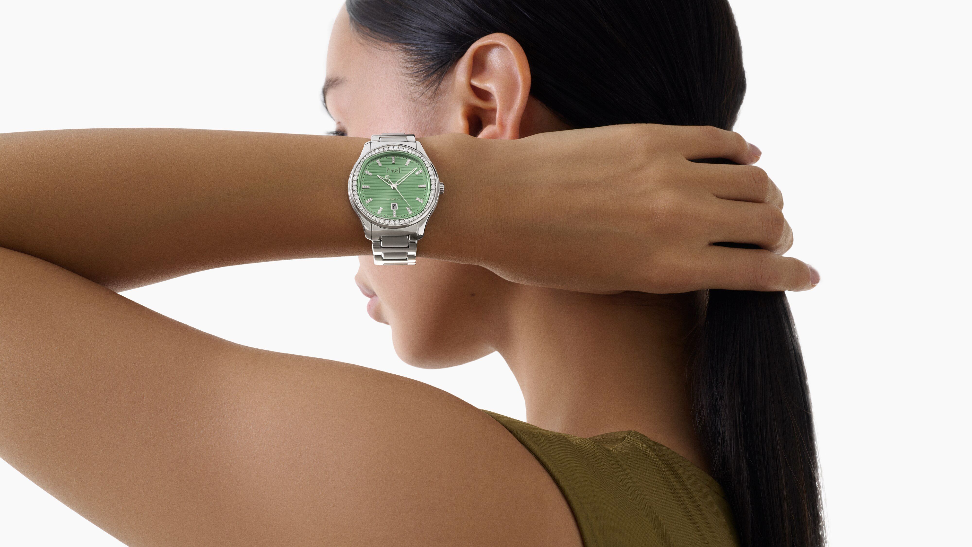 パステルグリーンの文字盤にラウンドブリリアントカットダイヤモンド36個(約0.08ct)をセットしたステンレススチール製インデックス