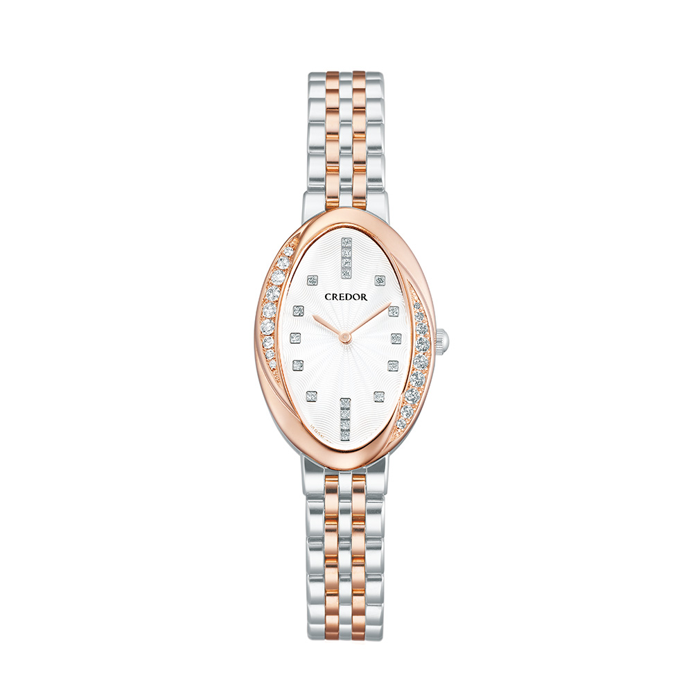 伸びやかなオーバル型のケースに、ドレスのドレープのような柔らかなひだをイメージしたベゼルを組み合わせたエレガントなモデルで、ベゼルとブレスレットの一部に18金ゴールドを使用しているため、ゴールドならではの華やかな輝きを愉しんでいただけます。