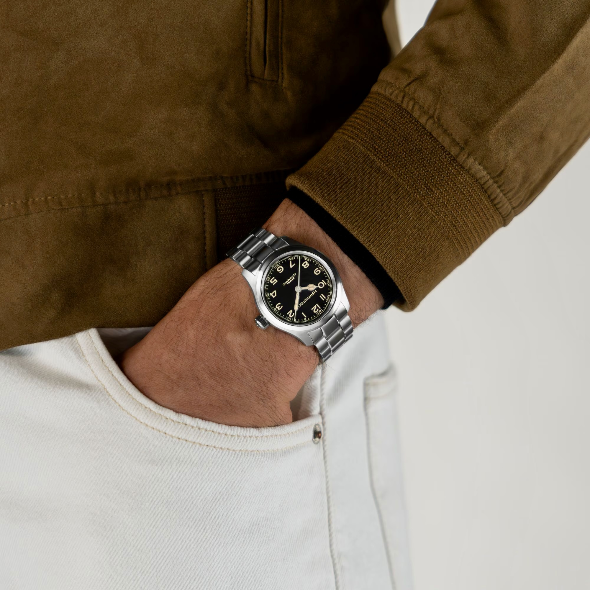 ブラックダイヤルに配された「カーキ フィールド マーフ」の数字はやや膨らみを持ち、視認性が向上。カテドラル針がビンテージルックを添えます。