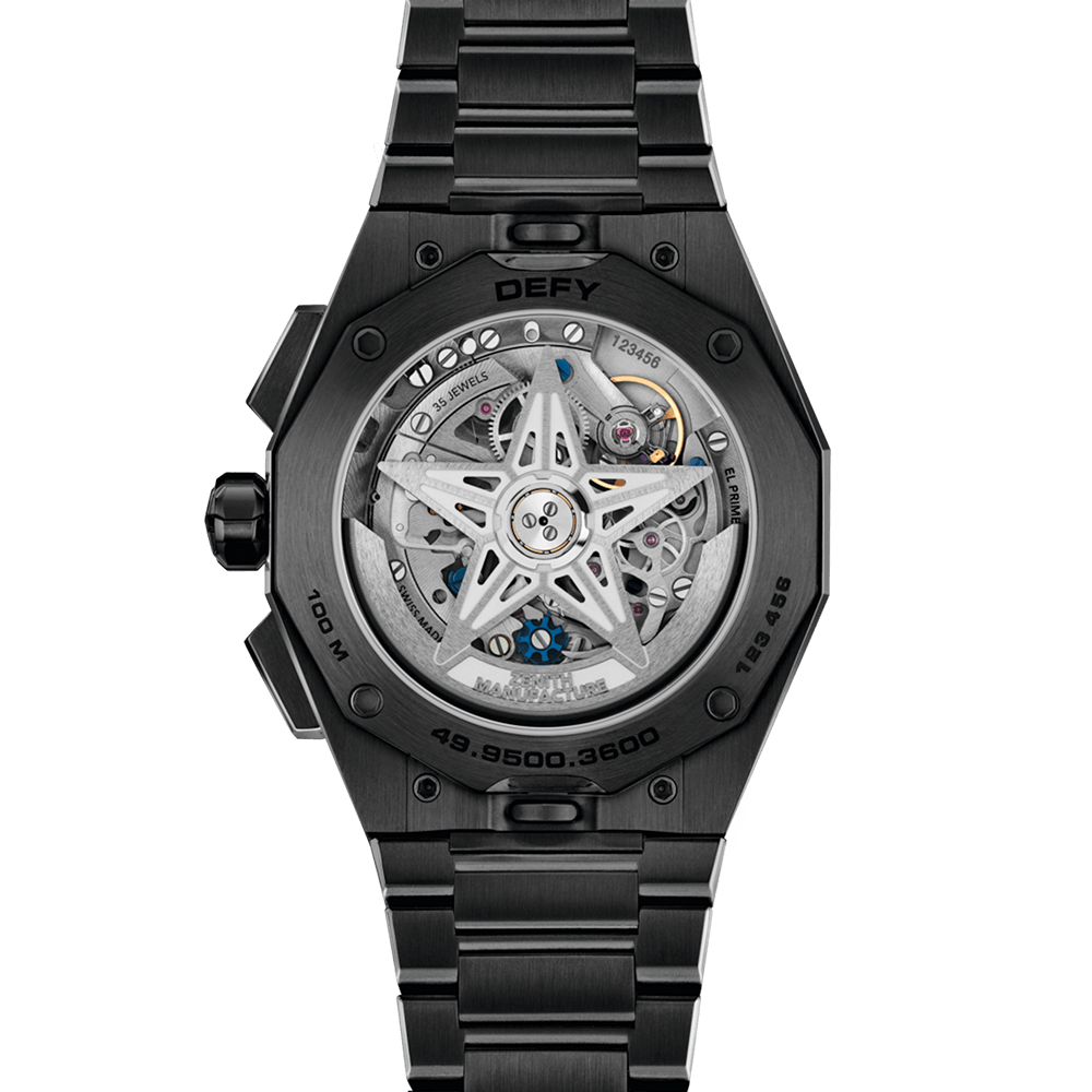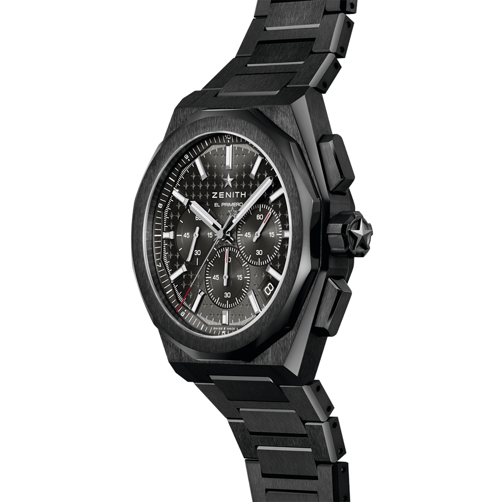 八角形の42mmブラックセラミックケースに、ファセットカットのベゼルを配した「デファイ スカイライン クロノグラフ」。グレーのグラデーション文字盤には星空が描かれています。世界初の1/10秒精度を誇るインジケーターを備えた高振動コラムホイール式クロノグラフ 自社製自動巻ムーブメント エル・プリメロ 3600を搭載。ブラックセラミックのブレスレットと、ブラックのラバーストラップが付属し、ストラップチェンジシステムにより簡単に付け替え可能です。