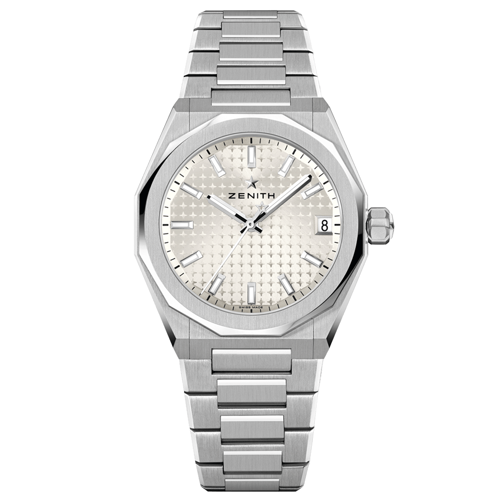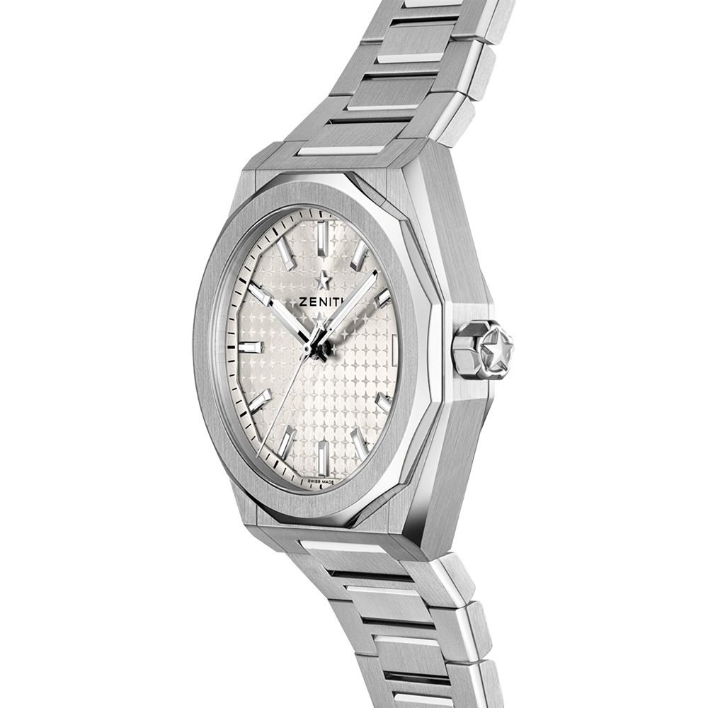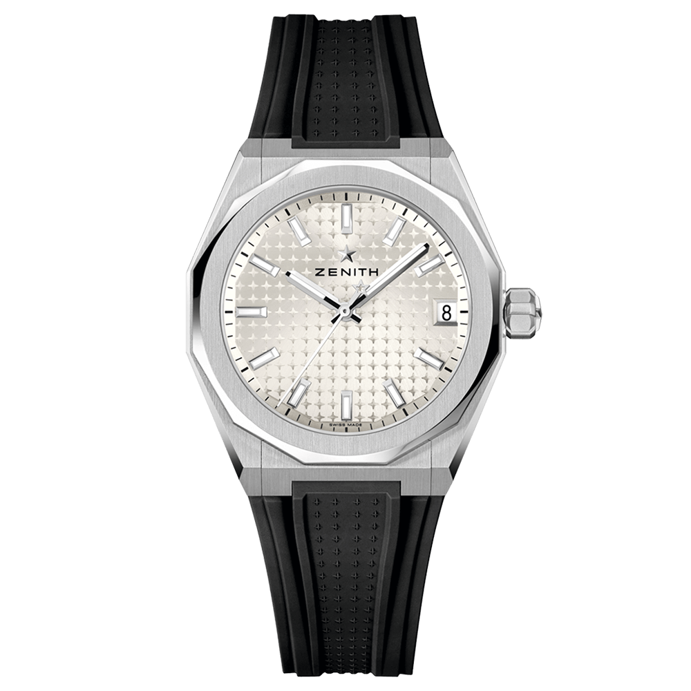 八角形の36mmスチールケースに、ファセットカットのベゼルを配した「デファイ スカイライン」。サンレイパターンを施したシルバートーン文字盤には、ゼニスの象徴である4つの点を結んだ星があしらわれています。エリート 670 自社製自動巻ムーブメントは、シースルーケースバックから眺めることができます。スチールブレスレットと、ブラックのラバーストラップが付属し、ストラップチェンジシステムにより簡単に付け替え可能です。
