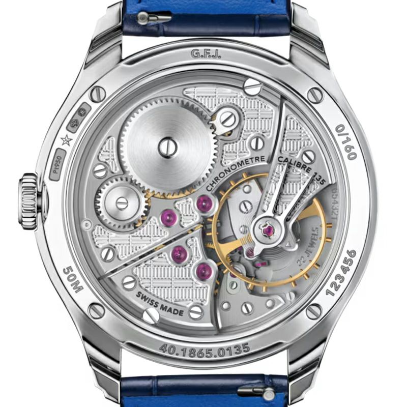天文台によるクロノメーターコンクールの黄金時代に、最多の賞に輝いた伝説的なキャリバー135を蘇らせたエレガントなG.F.J.。本質を損なうことなく、正確性や精度をはじめ、全ての性能を向上させるため、新たに設計されました。スレンダーな39mmのプラチナ製ラウンドケースは、段差の付いたベゼルと曲線的なラグを特徴。3つのパートで構成されるブルー文字盤は、ブリックのギョーシェ模様、ラピスラズリ、マザー・オブ・パールを組み合わせています。3本のストラップが付属。ダークブルーのアリゲーターレザーストラップ、ブラックのカーフレザーストラップ、ブルーの“サフィアーノ”カーフレザーストラップが付いています。