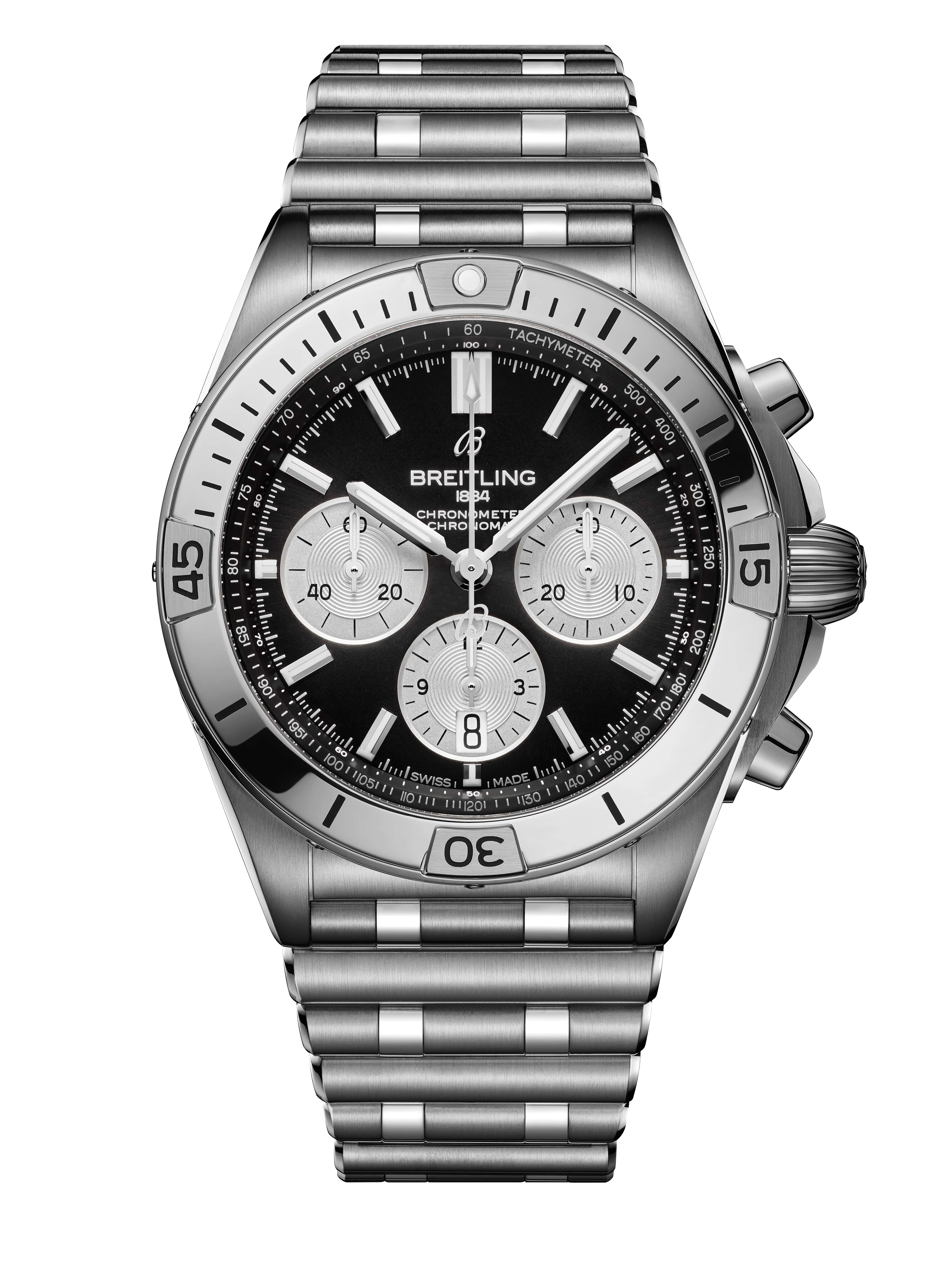 4カ所にライダータブを配したアイコニックな逆回転防止ベゼル。そして、独特な「ルーロー」ブレスレットがしっくりと馴染みます。ムーブメントはCOSC公認クロノメーターのブライトリング自社開発製造キャリバー01を搭載。サファイアクリスタルケースバックからはその美しいムーブメントを見ることができます。日本限定仕様はクロノグラフ秒針をシルバーに仕上げており、すっきりとまとまった意匠は現代的な印象を与えます。"