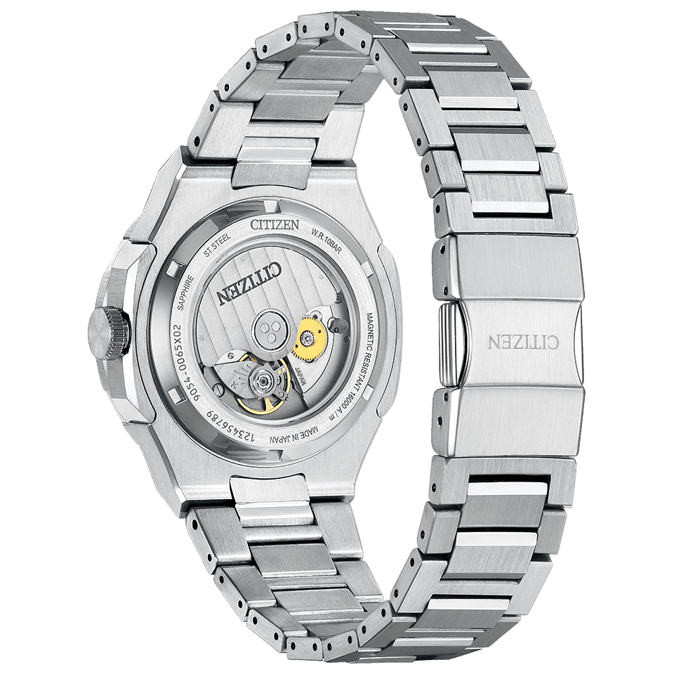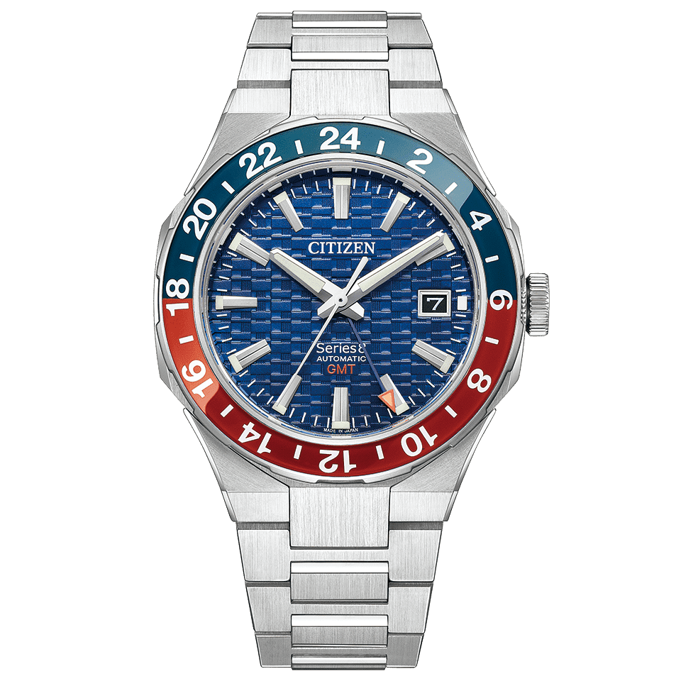 24時間針(GMT機能)を使い2つの都市の時間帯を表示でき、両回転ベゼルを使うことで3つの都市の時刻確認ができます。文字板には、東京の夜景をデザインソースに、ビル群の大きさの異なる四角い窓のイメージと、繁栄の意味を持ち日本で親しまれてきた市松模様を組み合わせた、シリーズエイトオリジナルのパターンをデザインしました。立体的で力強い2体構造のケースで複雑な磨き分けを施し、シャープな直線で構成される立体的な美しさを際立たせました。裏ぶたは、レギュラーモデル初のシースルーバック仕様です。