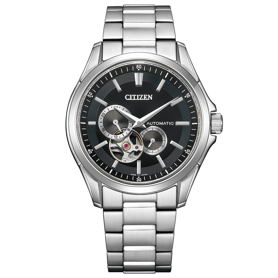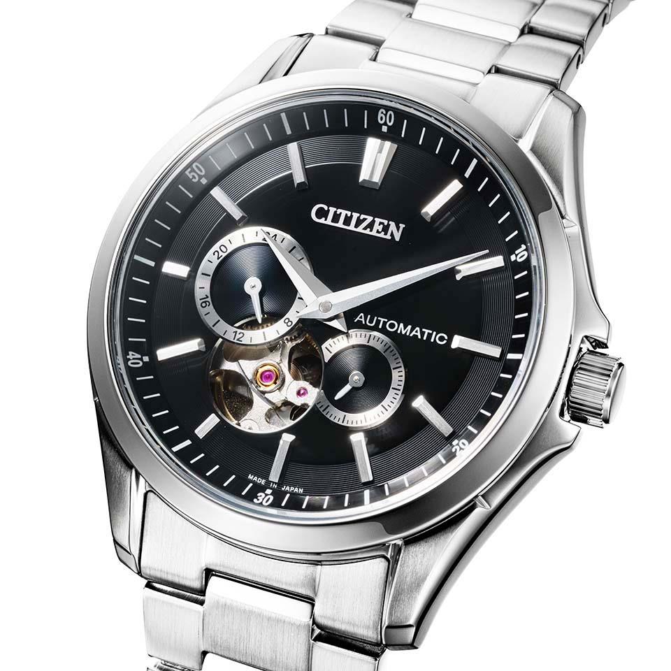 秒停止機能を搭載したキャリバーを搭載。シチズンコレクションのメカニカルウオッチがデザインをリニューアルしました。2つの別体リングを組み合わせた立体感、重厚感のあるデザイン。60秒針仕様のサブダイヤルなど、こだわりの機能を搭載しています。文字板7時の位置から、メカニカルウオッチの心臓部であるテンプの繊細な動きを堪能できるオープンハート仕様で、裏ぶたは回転する錘(おもり)部分とメカの動きを楽しめるシースルーバック。ご自身で、簡単にバンドのサイズが調整できるシンプルアジャスト仕様です。