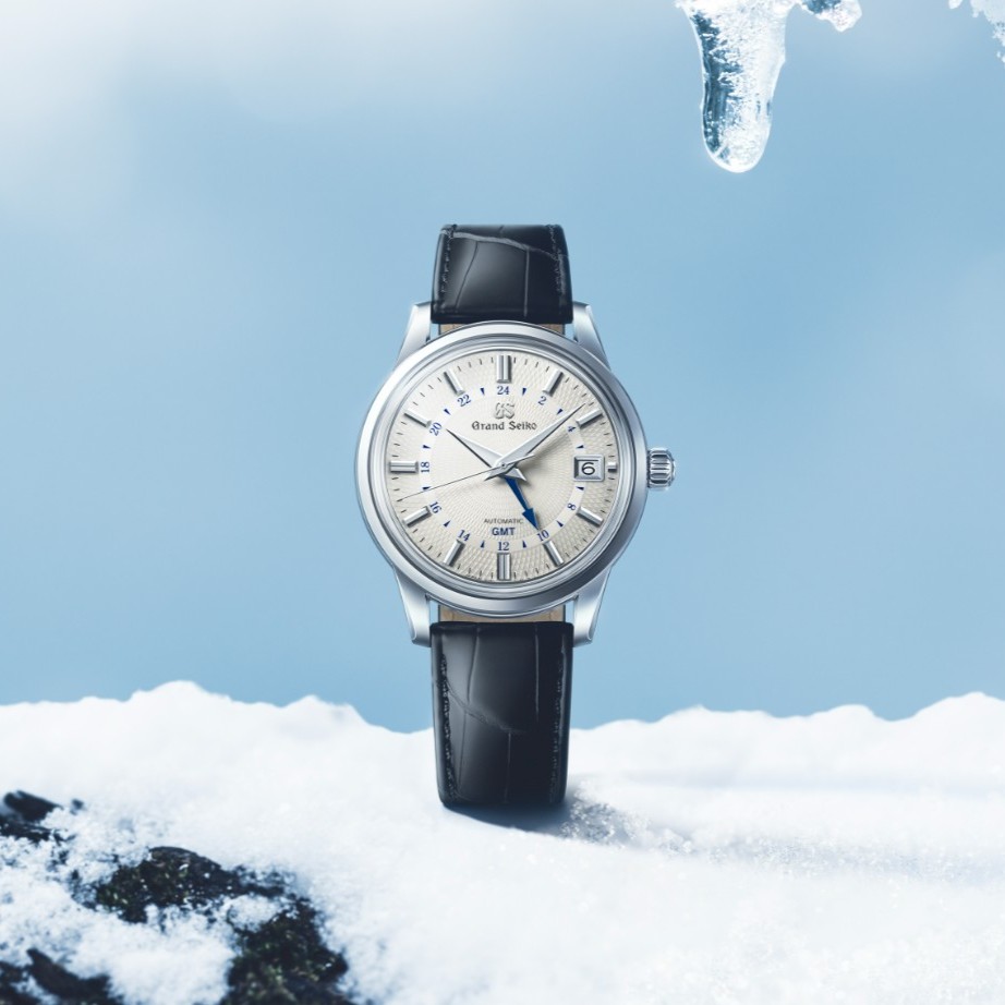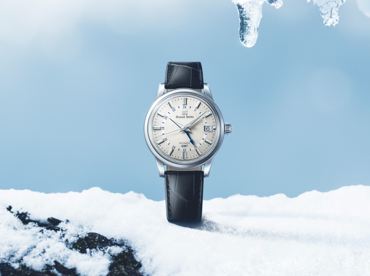 早春の季語「雪雫」から着想を得て、春の陽射しに輝く雪どけの雫をダイヤルに表現したクラシックスタイルのGMT機能付きモデル。
