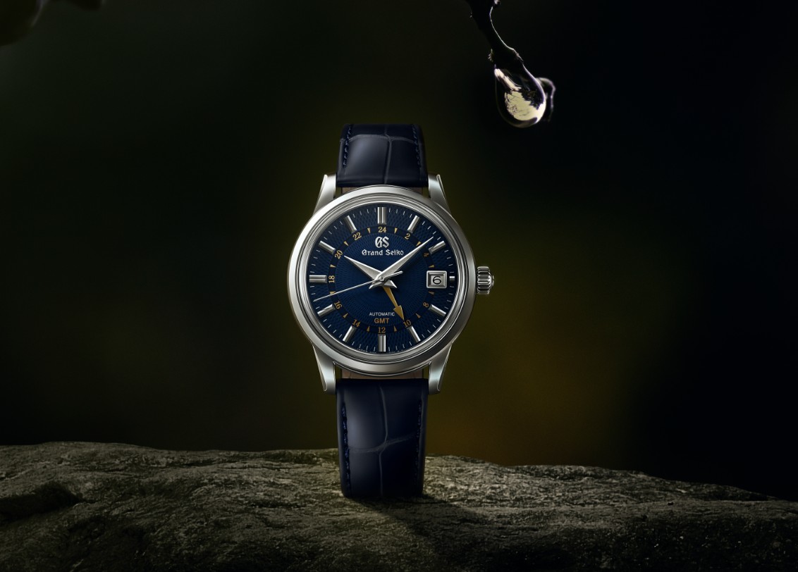 秋の季語「月雫」から着想を得て、月の光を浴びて輝く儚い露をダイヤルに表現したクラシックスタイルのGMT機能付きモデル。