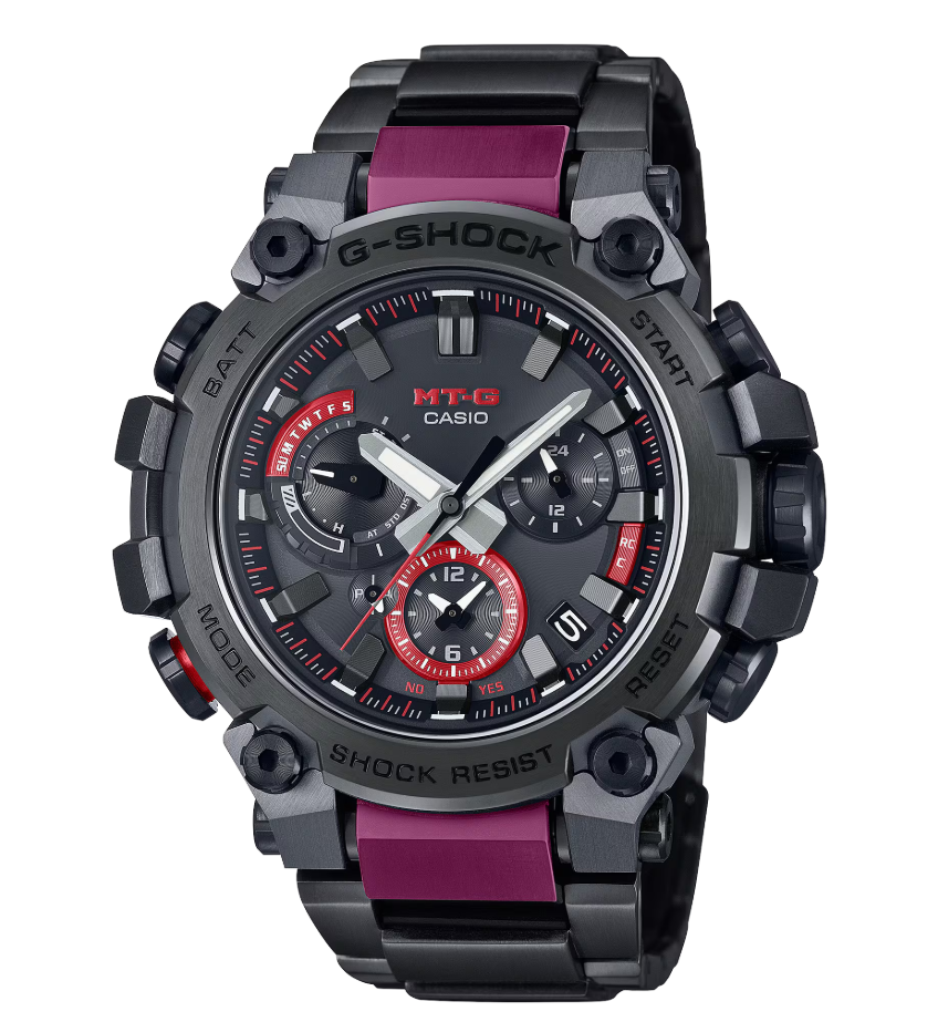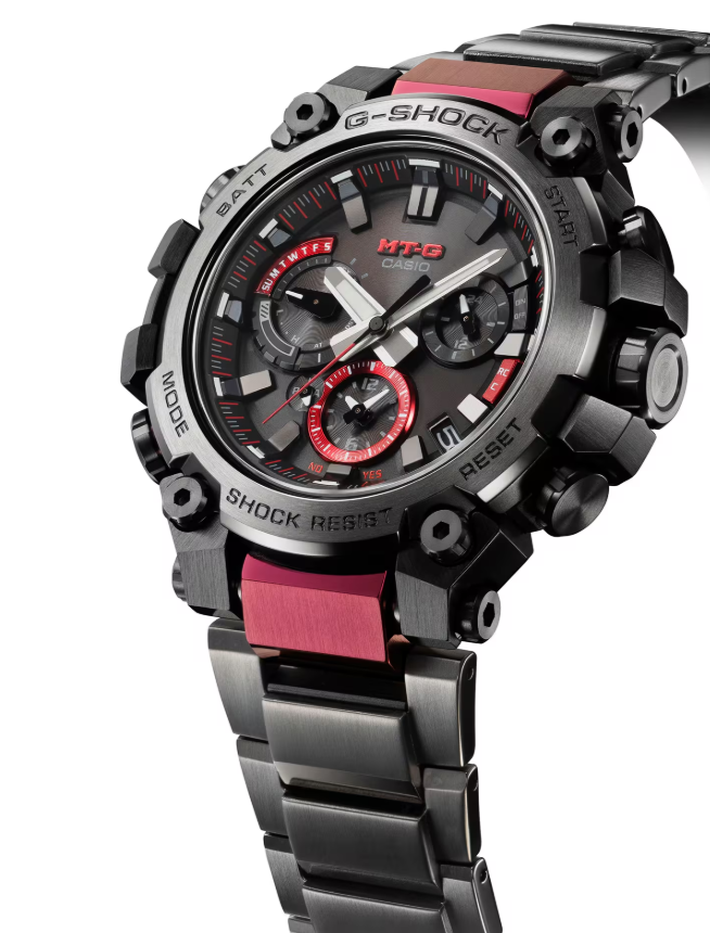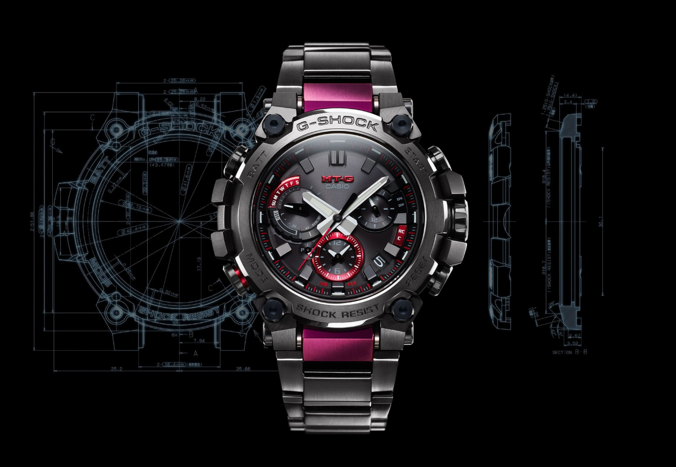メタル素材とG-SHOCKの起源である樹脂素材を融合して革新的な構造美を追求するMT-Gシリーズ。