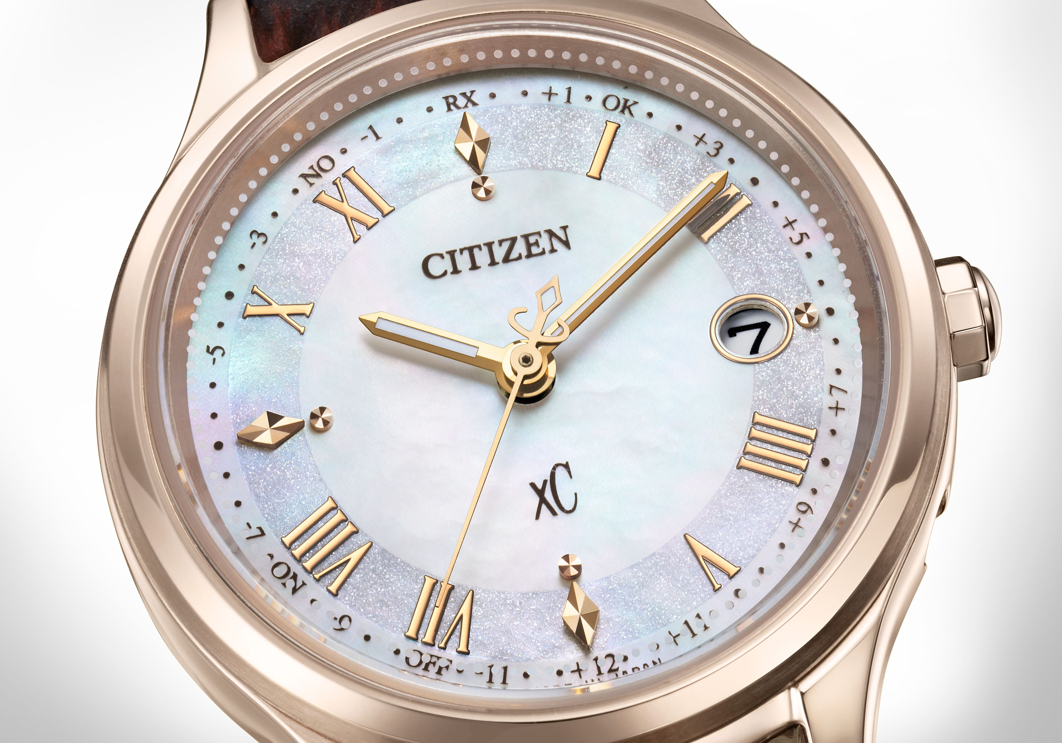 光の環をイメージした、すっきりと細く艶やかなベゼルに差し込む光を表現したカットパーツをあしらった白蝶貝の文字板が、上品でさりげない輝きを添えます。