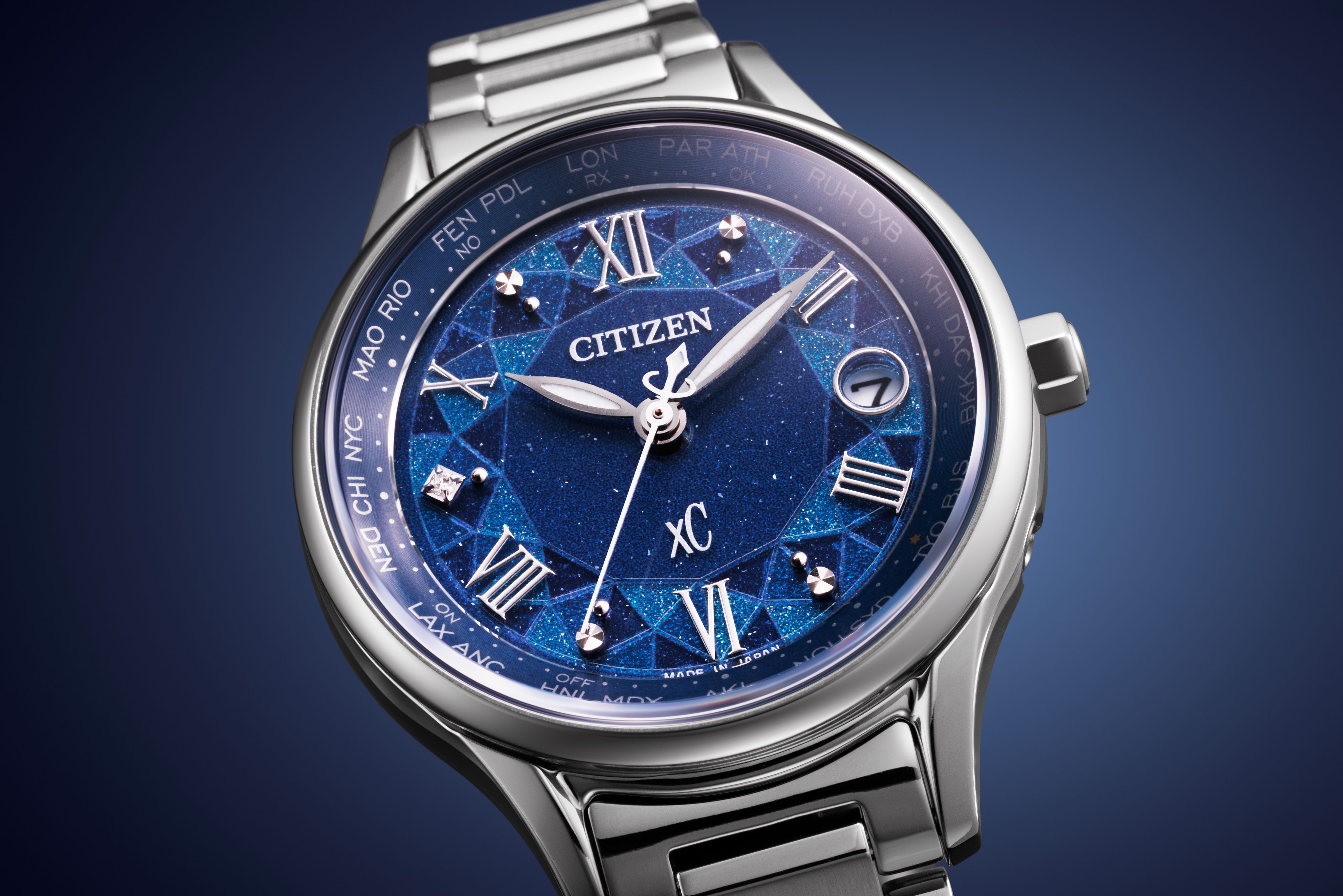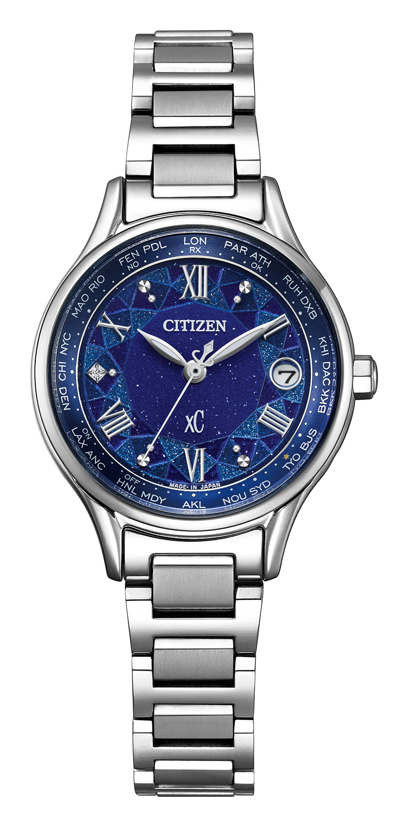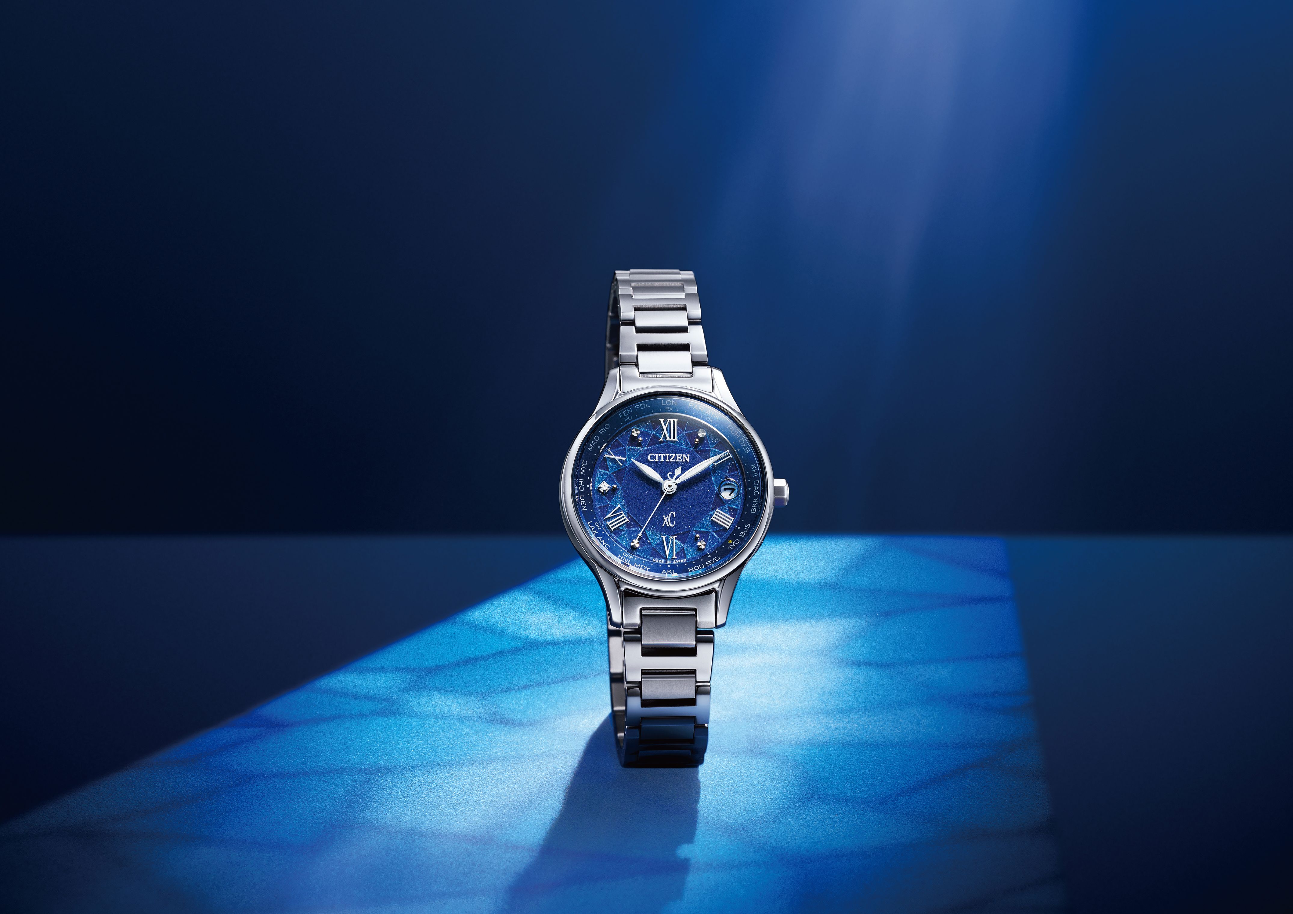 冬の澄んだ空気を表現したブルーの文字板に、ステンドグラスのキラキラとした輝きをイメージしたパターンを繊細に描いています。
