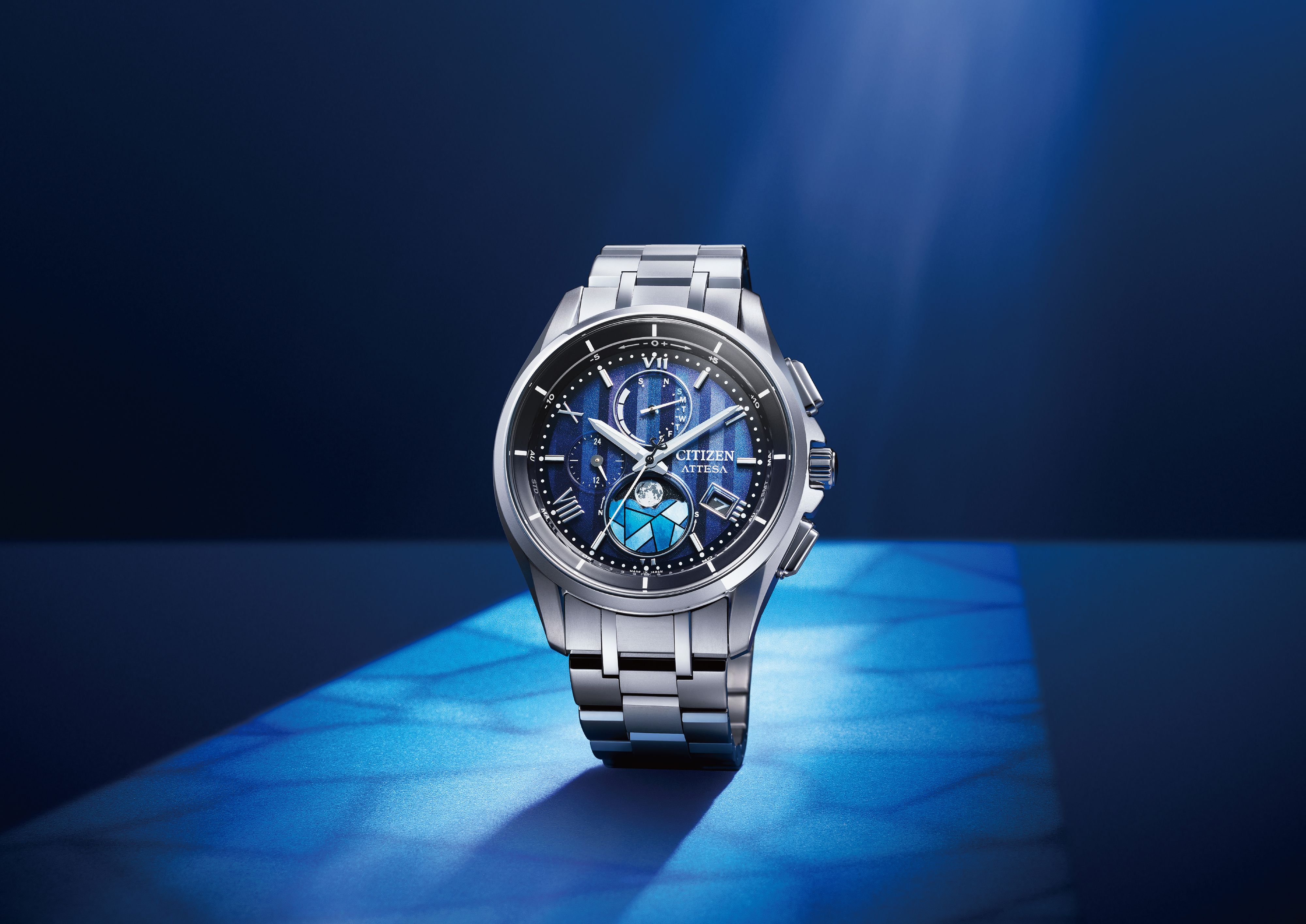縦のブルーグラデーションで教会に降り注ぐさまざまな光を文字板に描きました。また、ムーンフェイズの月齢を覆うエリアに半透明の印刷を施した白蝶貝を使い、美しく光るステンドグラスを表現しています。