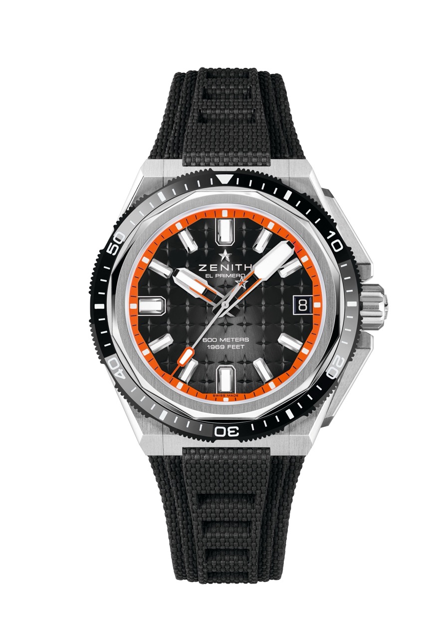 42.5mmの角張ったチタン製のケースが目を引く「デファイ エクストリーム ダイバー」。ブラックセラミック製回転ベゼルとヘリウムエスケープバルブ、60気圧の防水機能を備えています。星空を描いたブラック文字盤には、夜光塗料を塗布したマーカーと針が配されています。約60時間のパワーリザーブを備える「エル・プリメロ 3620 SC」自動巻ムーブメントを搭載。交換可能なストラップシステムが採用され、チタンブレスレットに加え、セカンドストラップが2本付属。ブラックラバーストラップおよび漁網のリサイクルファブリック素材で作られたエクストラロングストラップが付属します。