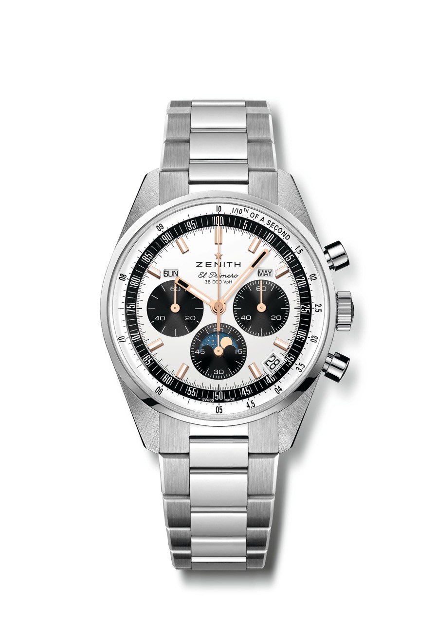38mmのスチールケースにブレスレットを合わせたクロノマスター オリジナル トリプルカレンダー。「パンダ」デザインを採用したシルバーホワイトの文字盤は、曜日、日付、月表示とムーンフェイズ表示を備えています。1/10秒計測を可能にするエル・プリメロ 3610 高振動自動巻クロノグラフ ムーブメントを搭載。約60時間のパワーリザーブを実現します。