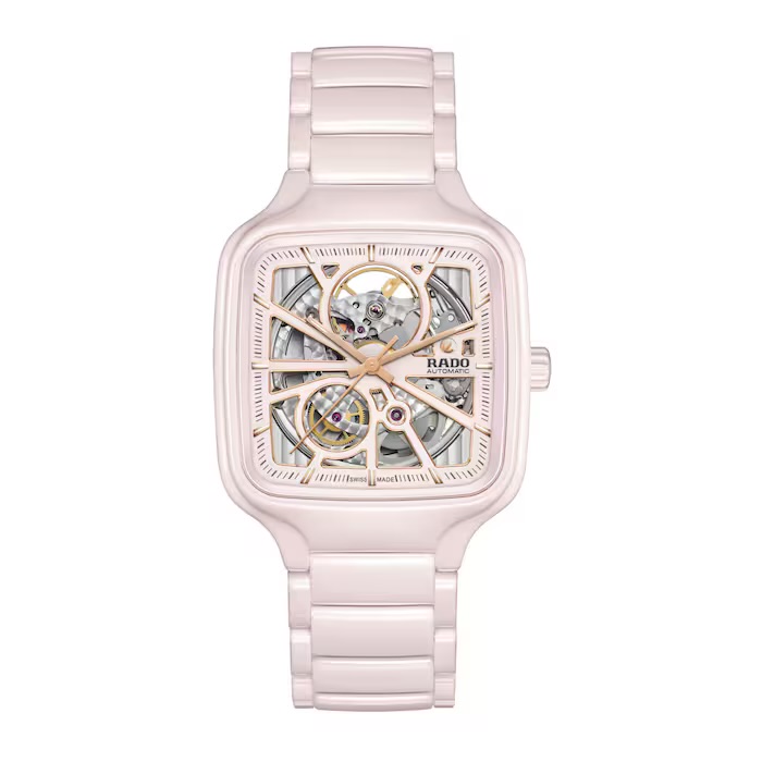Rado True Square open heart(ラドー トゥルー スクエア オープンハート)は、スイスの高度な時計製造技術と革新的な素材が見事に融合した、比類のないスケルトンウォッチです。 38mmのポリッシュ仕上げのローズハイテクセラミックス製モノブロックケースは、軽量で低刺激性、並外れた硬度と耐久性を備え、1,250ビッカース硬度と評価されています。25個のジュエル、80時間のパワーリザーブ機能、耐磁性のNivachron™(ニバクロン)ひげぜんまいを備えたキャリバー R734は、弾力性に優れたケースが自慢です。