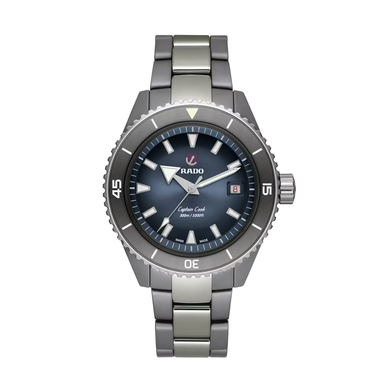 Captain Cook High-Tech Ceramic Diverウォッチは、防水が最大30気圧 (300 m)。ISO 6425認証ダイバーズウォッチの針とインデックスにはSuperLuminova®がコーティングされていて、サンレイ ブルー ラッカー塗装とポリッシュ仕上げのダイアルの素晴らしい視認性が保証されています。