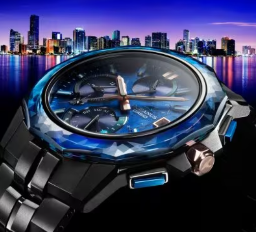 月の光に照らされた静かな海を、オールブラックのチタン外装と江戸切子のサファイアガラスベゼルで表現しました。