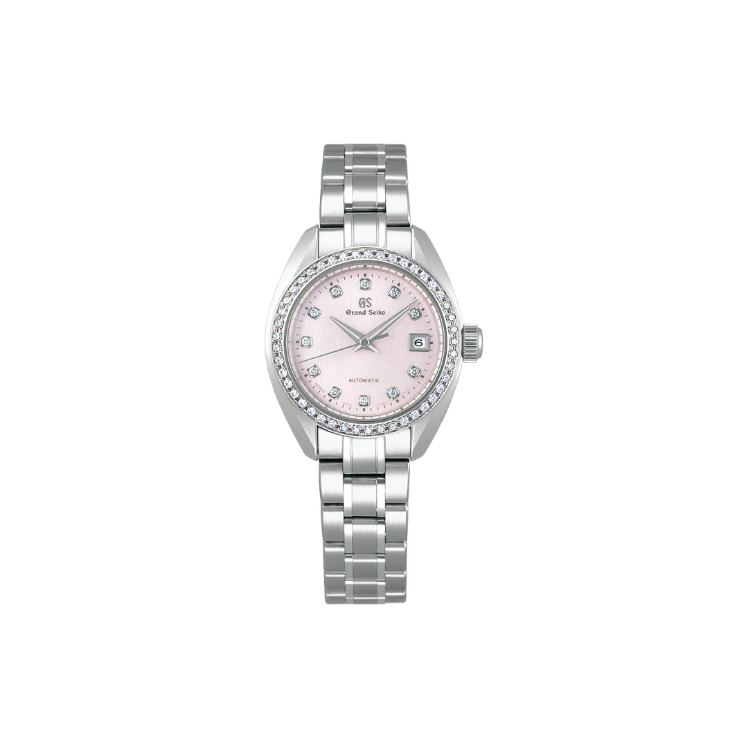 直径 27.8mm の小さなケースの中に本格的なメカニカルムーブメントを搭載した、日常で使いやすいステンレススチールモデルです。 ダイヤルには、美しい絹の布のような型打模様が施され、ほんのり紅みを含んだ薄桜(うすざくら)色に染められています。さらに、ベゼルに 45 個、アワーマークに 11 個配置され たダイヤモンドと相まって腕もとで華やかに輝きます。