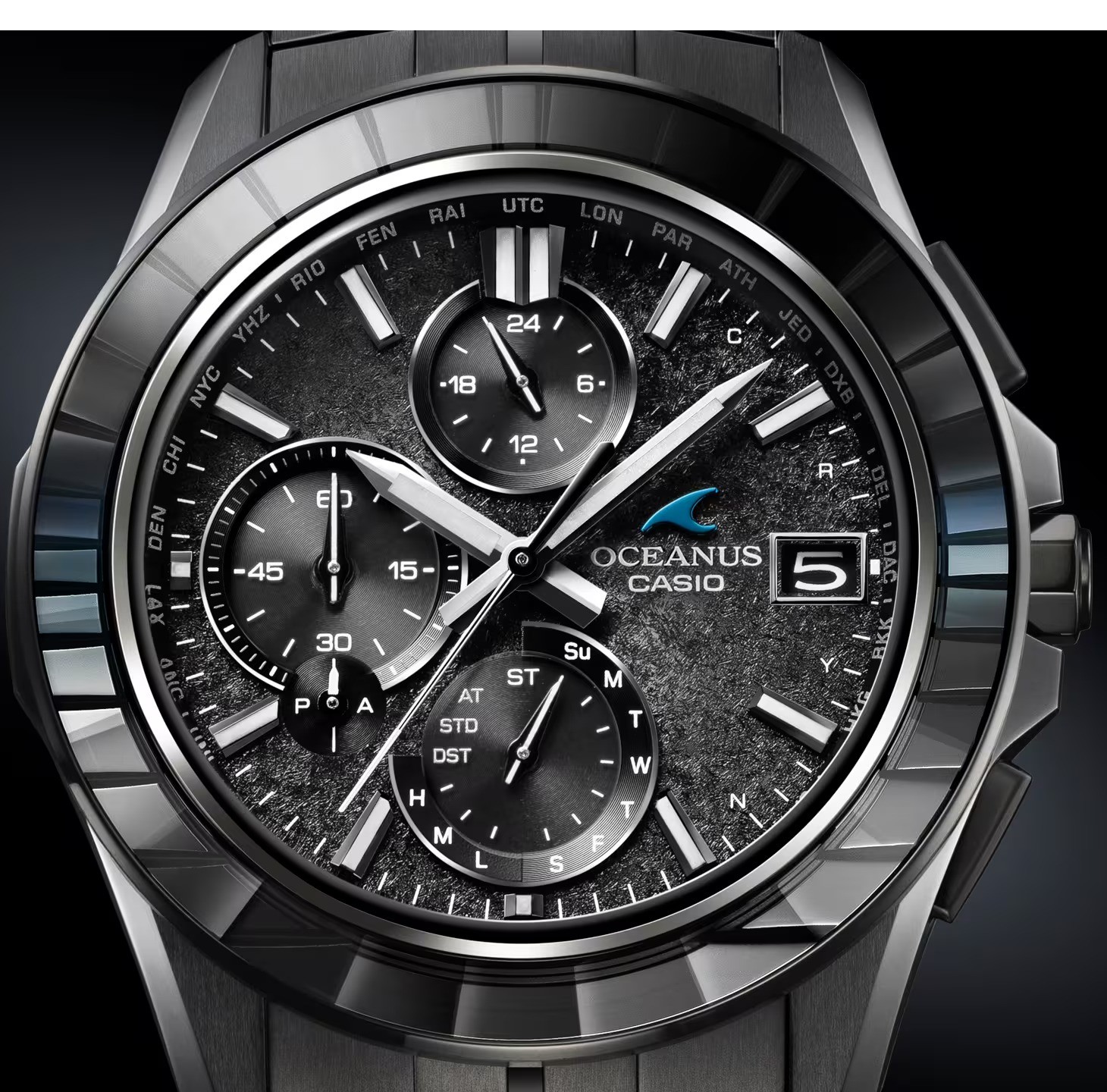 OCW-S7000CN-1Aは、OCEANUSが誇るものづくりの技術と日本の伝統技法が美しく融合したモデルです。上下で異なるカッティングラインが美しいサファイアガラスベゼルが特徴で、江戸切子の職人が一つひとつ手作業でカットを施して仕上げています。