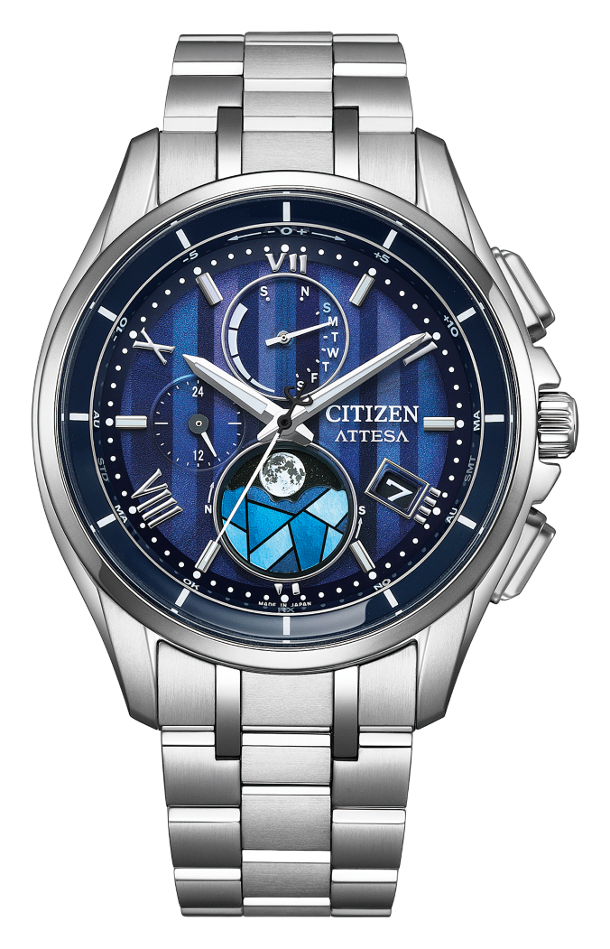 月齢自動計算機能「ルナプログラム」搭載モデルを限定仕様にアレンジ。デュラテクトプラチナのケースとバンドが、荘厳で神聖な印象を醸し出します。縦のブルーグラデーションで教会に降り注ぐさまざまな光を描いた文字板に、ローマ数字とバーインデックスを組み合わせたエレガントなデザインです。ムーンフェイズの月齢板を覆うエリアには半透明の印刷を施した白蝶貝を使い、美しく光るステンドグラスを表現。まるでステンドグラス越しの夜空を見上げるように、今宵の月の満ち欠けを確認できます。DEAR Collection