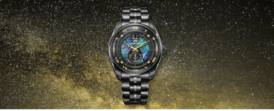 ローマ数字や針のゴールドと艶のあるブラックのケースとバンドが、宙そのものを表現しています。