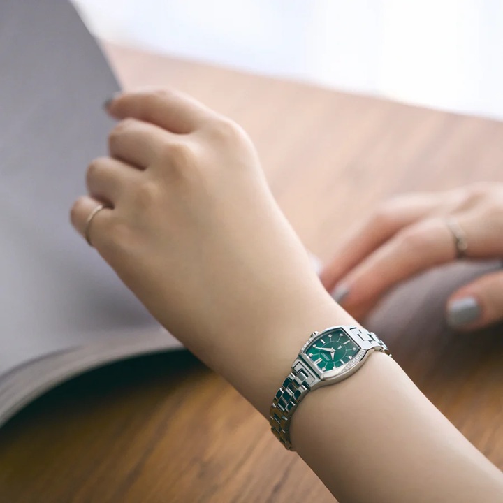 美しいモミの木のような深いグリーンの白蝶貝ダイヤルに、木々に降り積もる雪の煌めきを4箇所のラボグロウン・ダイヤモンドと輝くインデックスで繊細に表現しております。