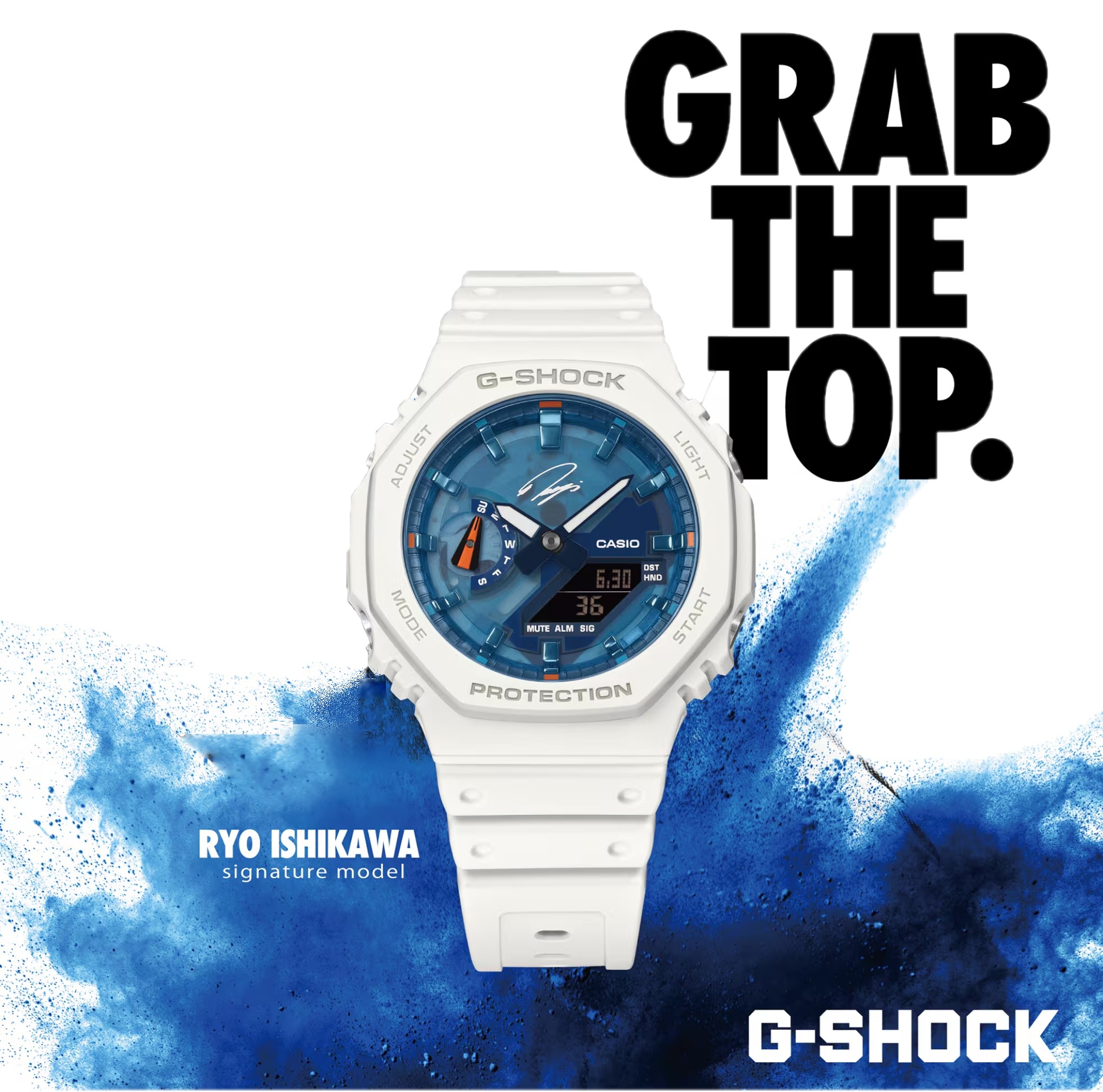 ゴルフスイング中も邪魔にならない薄型ケースのGA-2100をベースとし、文字板には闘志を秘めた冷静のブルー、全体は潔さと覚悟を表すホワイト、差し色には希望を意味するオレンジを配色。どんなゴルフウェアにも合わせやすいカラーリングにとなっております。また、文字板はスケルトンを採用することで、今までにない印象的なデザインに。石川遼選手のサインを12時位置と裏蓋に施し、トレーディングカードが付属したスペシャルパッケージと合わせ、特別な仕様となっております。