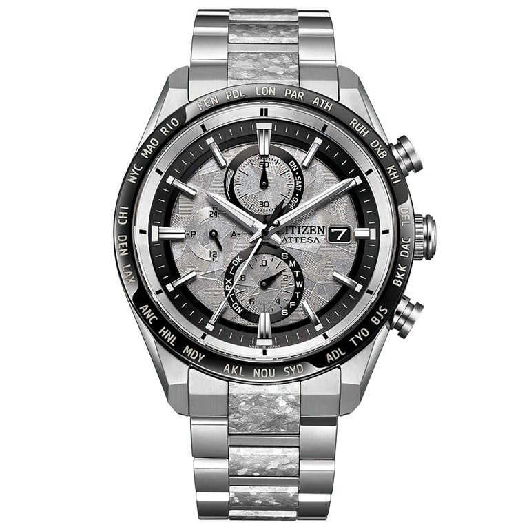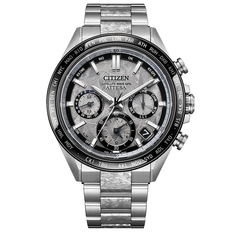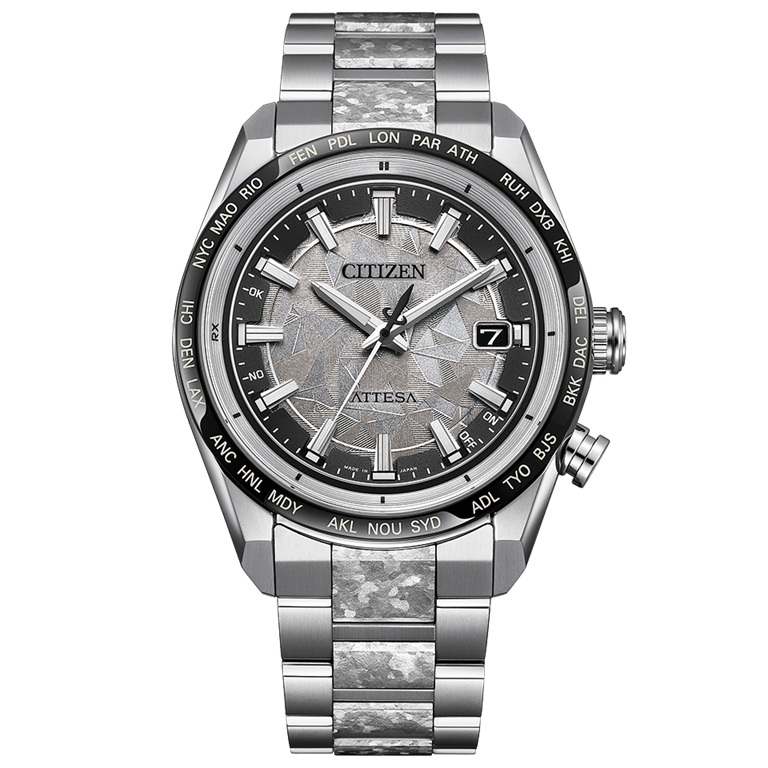 文字盤には結晶チタニウムを想起させるパターンとメタリック塗装を施し、同様の塗装を施した見返しリングにより、織りなす光が表現されております。シチズン独自の技術で生まれた「結晶チタニウム」に、デュラテクトプラチナをコーティングした中駒を採用。高温の熱処理によって生まれる結晶模様は、二つとして同じものがなく、見る角度によって輝きの表情を変えながら唯一無二の存在感を腕元に宿します。