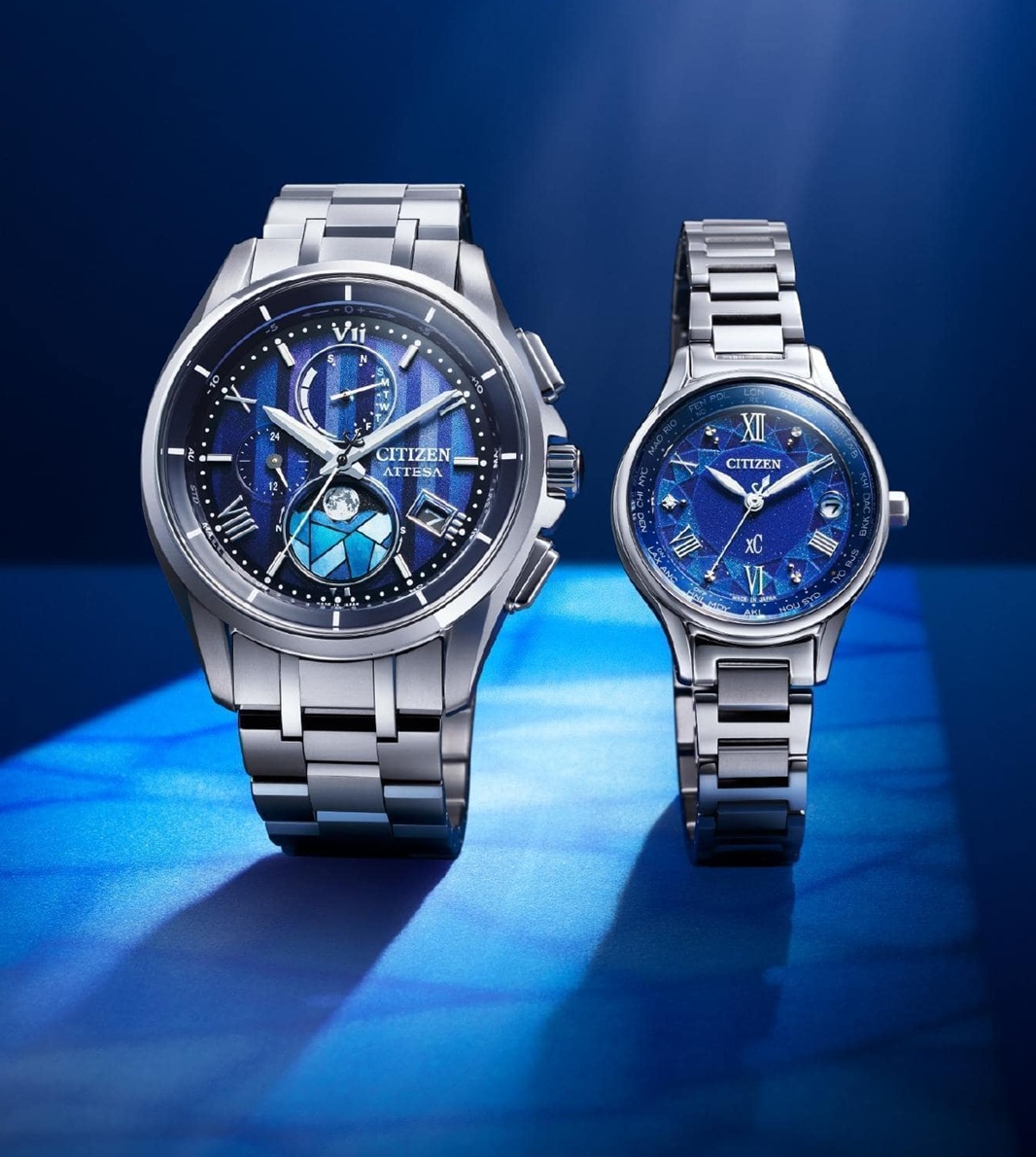 EC1160-71Lは、澄み切った冬の空気を表現したブルーの文字板に、ステンドグラスをイメージしたパターンで、光によってキラキラと輝く様子を表現。インデックスにはローマ数字とカットパーツ、9時位置にはラボグロウン・ダイヤモンドをセッティングし、時計全体の美しさを引き立てます。