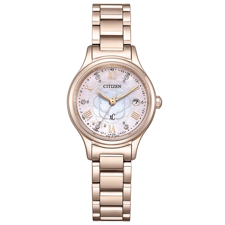 エッチングで描いた美しいカメリアが淡いグラデーションとパールをまとい、華やかに咲き誇ります。花びらは光の粒を思わせるドットで縁取りし、カメリアのもつ、ころんと愛らしい雰囲気をプラス。インデックスには、ローズゴールドのローマ数字と可憐に輝くラボグロウン・ダイヤモンドを交互に配置。「控えめな美」の花言葉をもつカメリアに相応しいシックでエレガントなデザインです。