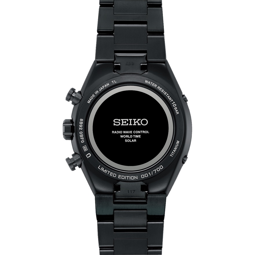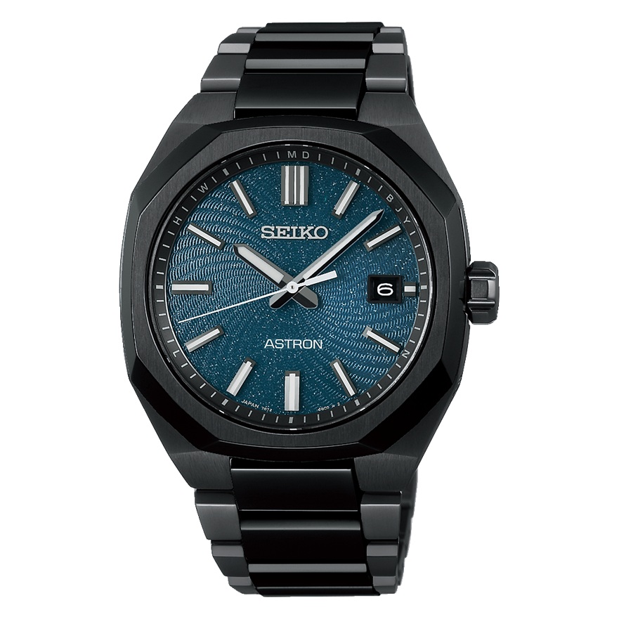 文字版には新たに開発した渦巻く銀河をイメージした「スパイラルパターン」の型打ち模様を施しました。ダイヤルの中心から広がる螺旋は、流れる星々のエネルギーを伝えます。また、漆黒な宇宙の中で渦巻く銀河が浮かび上がる様を、オールブラックカラーのケース・ブレスレットと、ダークターコイズカラーをベースとしたラメ入りダイヤルが表現しております。