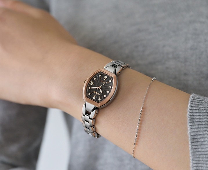 『ES9485-52E』は、人気のあるお花をモチーフにしたバンドに、ピンクゴールドのベゼルを合わせたツートン仕様。柔らかく広がる光をデザインに込め、新しいときを感じる表情に仕上げました。文字板にはシルバーのラメを練り込み、中央から光が広がるような放射パターンを組み合わせ、華やかさと奥行きのある幻想的なデザインに。放射パターンに沿って、11ポイントのダイヤモンドをあしらった限定モデルです。
