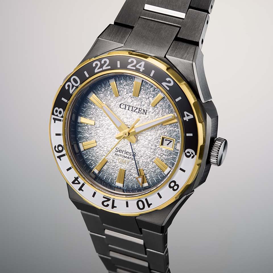 GMT機能付きムーブメントCal.9054を搭載。グレーめっきをベースに、アクセントカラーとしてホワイトとゴールドを使い、都市の灯りに照らされた雪の夜を表現しています。文字板は、ホワイトからブラックへのグラデーションで仕上げたオリジナルパターンを採用。アスファルトを覆う降り積もる雪が、都市の灯りに照らされている様子をイメージしています。ベゼル・インデックス・針に、夜の都市の灯りを想起させるゴールドをあしらい、特別感をきわだたせています。