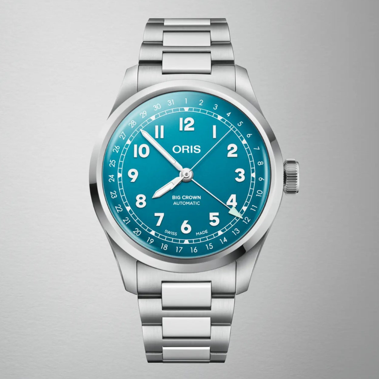 直径40mmの鮮やかなターコイズブルーが美しいダイヤル、ステンレススチールケース、Hリンクブレスレットを採用。Orisが独自開発したクラスプはまるでつけていることを忘れるような心地。