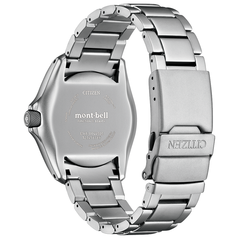 ダイバーズウオッチ用に開発されたCal.E168を搭載。アウトドアのハードな環境にも耐え抜くタフさ、昼夜問わない時刻の見やすさ、操作の簡単さといった、優れた実用性を備える1本です。ケースとバンドには打ちキズにも強いデュラテクトMRKを施しています。また、衝撃で外れないようメタルバンドにはダブルロックバックルを採用。裏ぶたレス構造のケースバックには、モンベルのブランドロゴをレーザー刻印。CITIZEN×mont-bellのロゴが入った専用ボックス付きです。