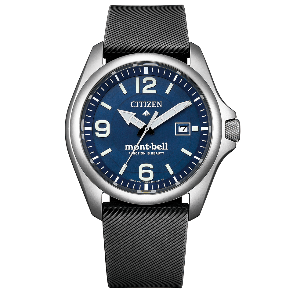 ダイバーズウオッチ用に開発されたCal.E168を搭載。アウトドアのハードな環境にも耐え抜くタフさ、昼夜問わない時刻の見やすさ、操作の簡単さといった、優れた実用性を備える1本です。ケースには打ちキズにも強いデュラテクトMRKを施しています。革バンドモデルは、シリコーンラバーバンド付属の2Way仕様。ご自身でシーンに合わせて交換できるインターチェンジャブル構造です。裏ぶたレス構造のケースバックには、モンベルのブランドロゴをレーザー刻印。CITIZEN×mont-bellのロゴが入った専用ボックス付きです。