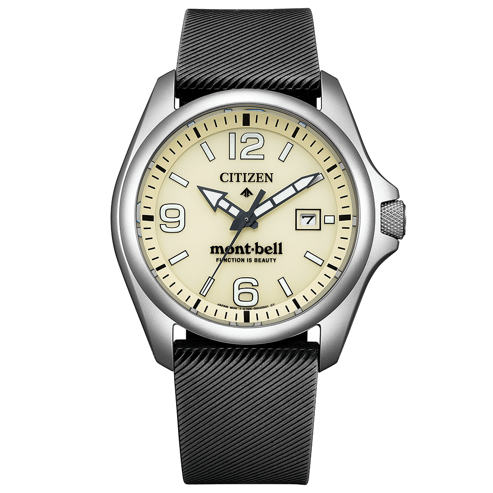 ダイバーズウオッチ用に開発されたCal.E168を搭載。アウトドアのハードな環境にも耐え抜くタフさ、昼夜問わない時刻の見やすさ、操作の簡単さといった、優れた実用性を備える1本です。ケースには打ちキズにも強いデュラテクトMRKを施しています。革バンドモデルは、シリコーンラバーバンド付属の2Way仕様。ご自身でシーンに合わせて交換できるインターチェンジャブル構造です。裏ぶたレス構造のケースバックには、モンベルのブランドロゴをレーザー刻印。CITIZEN×mont-bellのロゴが入った専用ボックス付きです。