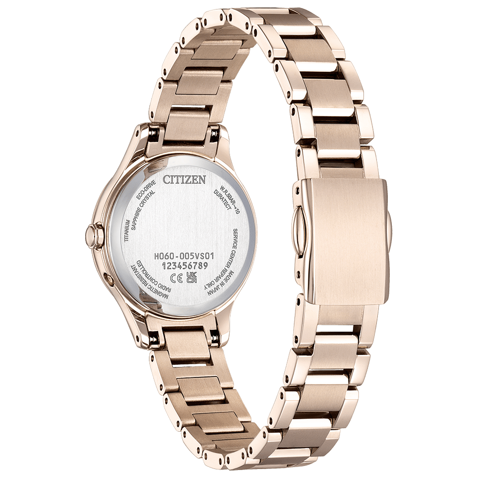 満開の美しいカメリア(椿)をモチーフにデザインした白蝶貝の文字板には、エッチングの花模様と“光の粒”が花びらに乗っているかのようなドットパターンを組み合わせ、愛らしさを表現しています。外周のピンクのグラデーションが、カメリアの華やかさと可愛らしさを引き立てています。