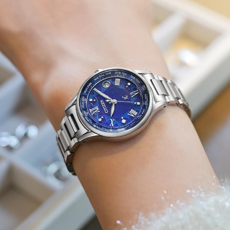 冬の澄んだ空気を表現したブルーの文字板に、ステンドグラスのキラキラとした輝きをイメージしたパターンを繊細に描いたデザイン。インデックスには、すっきりとした印象のローマ数字とともに、拡散する光を表現したカットパーツをレイアウトしています。9時の位置には1ポイントのラボグロウン・ダイヤモンドをセッティング。腕元に華やかさを添える1本です。
