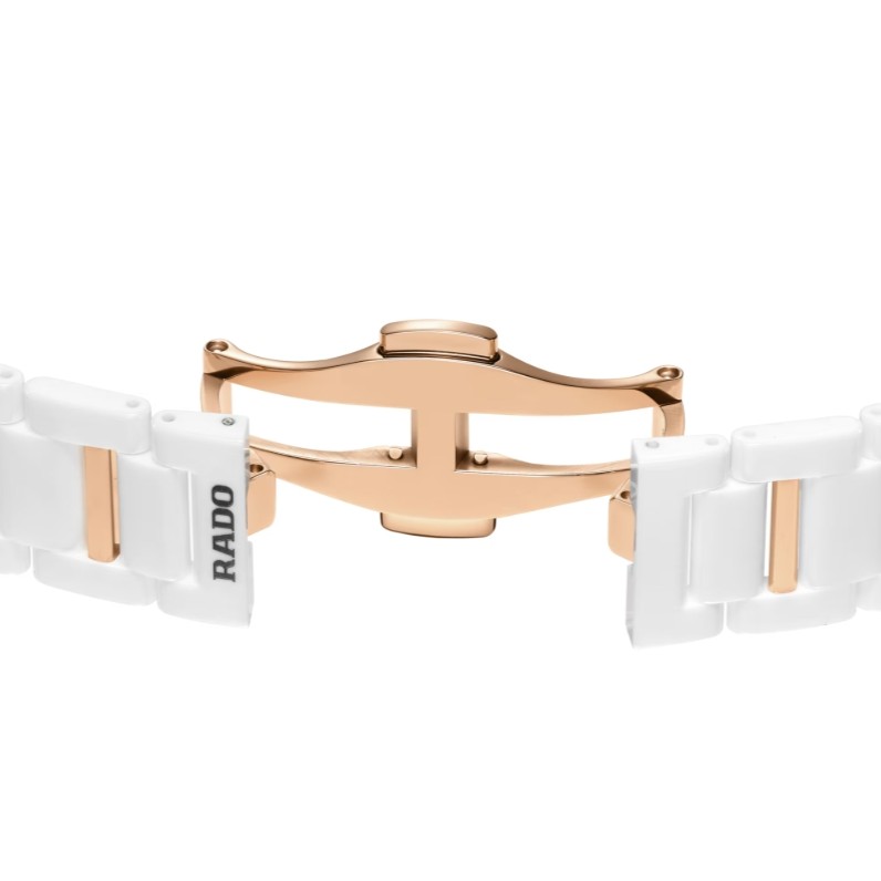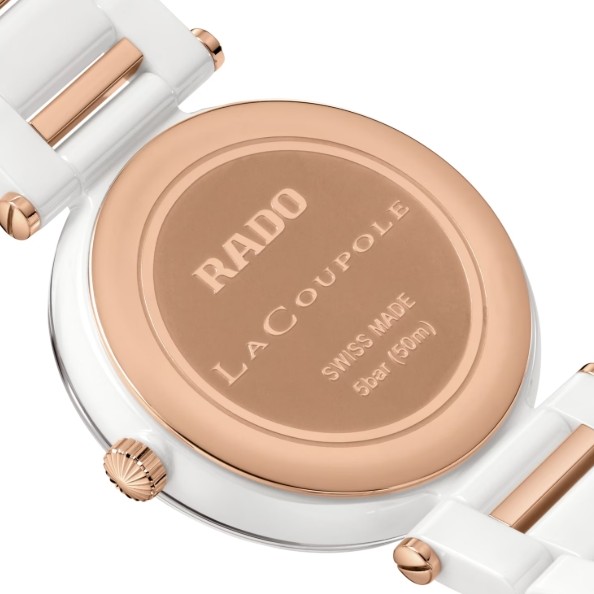 LaCoupole(ラ・クポール)は、歴代のアイコンたちに敬意を捧げると同時に、現代の洗練された感性にふさわしく再解釈されたタイムピースです。これは、ラドーだけが提供できる精度と革新による設計と、洗練された魅力を表現しています。 31mmのポリッシュ仕上げのホワイトハイテクセラミック製モノブロックケースは、ローズゴールドカラーのメタリックの縁取りが際立つドーム型のサファイアクリスタルで飾られています。ケースは5気圧(50m)の防水性を備え、日常使いに適した耐久性と不朽のエレガンスを兼ね備えています。そのシルエットは、まさにラドーを象徴するもの——しなやかで彫刻的、そしてタイムレスな美しさを湛えています。 シルバーのダイヤルには、ラッカーで仕上げた波状の装飾が施され、贅沢な立体感を生み出しています。11個のトップウェッセルトン フルカット ダイヤモンドがインデックスとして配置され、ダイヤルに静かな輝きをもたらし、6時位置の日付表示窓が、洗練された機能性を提供します。 その心臓部には、8石を使用したクオーツムーブメントR218を搭載。PreciDrive™テクノロジーにより、極めて高い精度を実現しています。 ケースを固定するのは、ポリッシュ仕上げのホワイトハイテクセラミック製ブレスレット。ローズゴールドPVD加工のパーツとクラスプが美しく調和し、全体のデザインを完成させます。LaCoupole(ラクポール)は、優雅さの象徴。人々の憧れをかき立て、永く寄り添うために創られたタイムピースです。