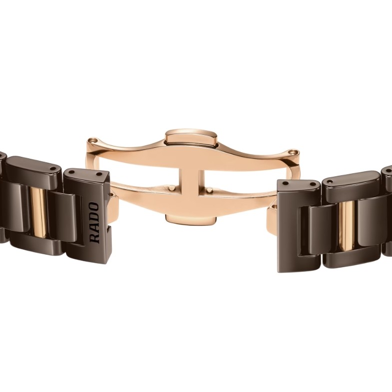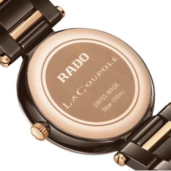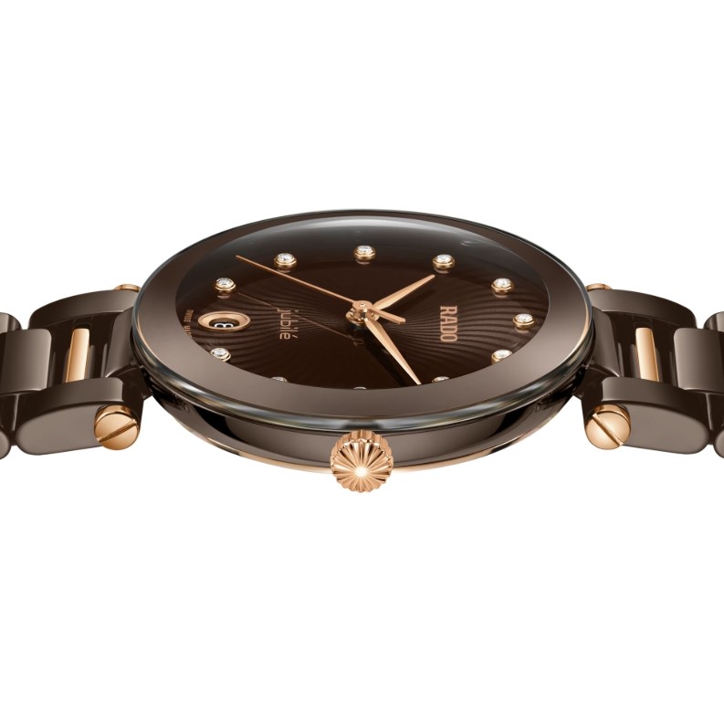 LaCoupole(ラ・クポール)は、歴代のアイコンたちに敬意を捧げると同時に、現代の洗練された感性にふさわしく再解釈されたタイムピースです。これは、ラドーだけが提供できる精度と革新による設計と、洗練された魅力を表現しています。 31mmのポリッシュ仕上げのブラウンハイテクセラミック製モノブロックケースは、ラウン&ローズゴールドカラーのメタリックの縁取りで際立つドーム型のサファイアクリスタルで飾られています。ケースは5気圧(50m)の防水性を備え、日常使いに適した耐久性と不朽のエレガンスを兼ね備えています。そのシルエットは、まさにラドーを象徴するもの——しなやかで彫刻的、そしてタイムレスな美しさを湛えています。 ブラウンダイヤルには、ラッカーで仕上げた波状の装飾が施され、贅沢な立体感を生み出しています。11個のトップウェッセルトン フルカット ダイヤモンドがインデックスとして配置され、ダイヤルに静かな輝きをもたらし、6時位置の日付表示窓が、洗練された機能性を提供します。 その心臓部には、8石を使用したクオーツムーブメントR218を搭載。PreciDrive™テクノロジーにより、極めて高い精度を実現しています。 ケースを固定するのは、ポリッシュ仕上げのブラウンハイテクセラミック製ブレスレット。ローズゴールドPVD加工のパーツとクラスプが美しく調和し、全体のデザインを完成させます。LaCoupole(ラクポール)は、優雅さの象徴。人々の憧れをかき立て、永く寄り添うために創られたタイムピースです。