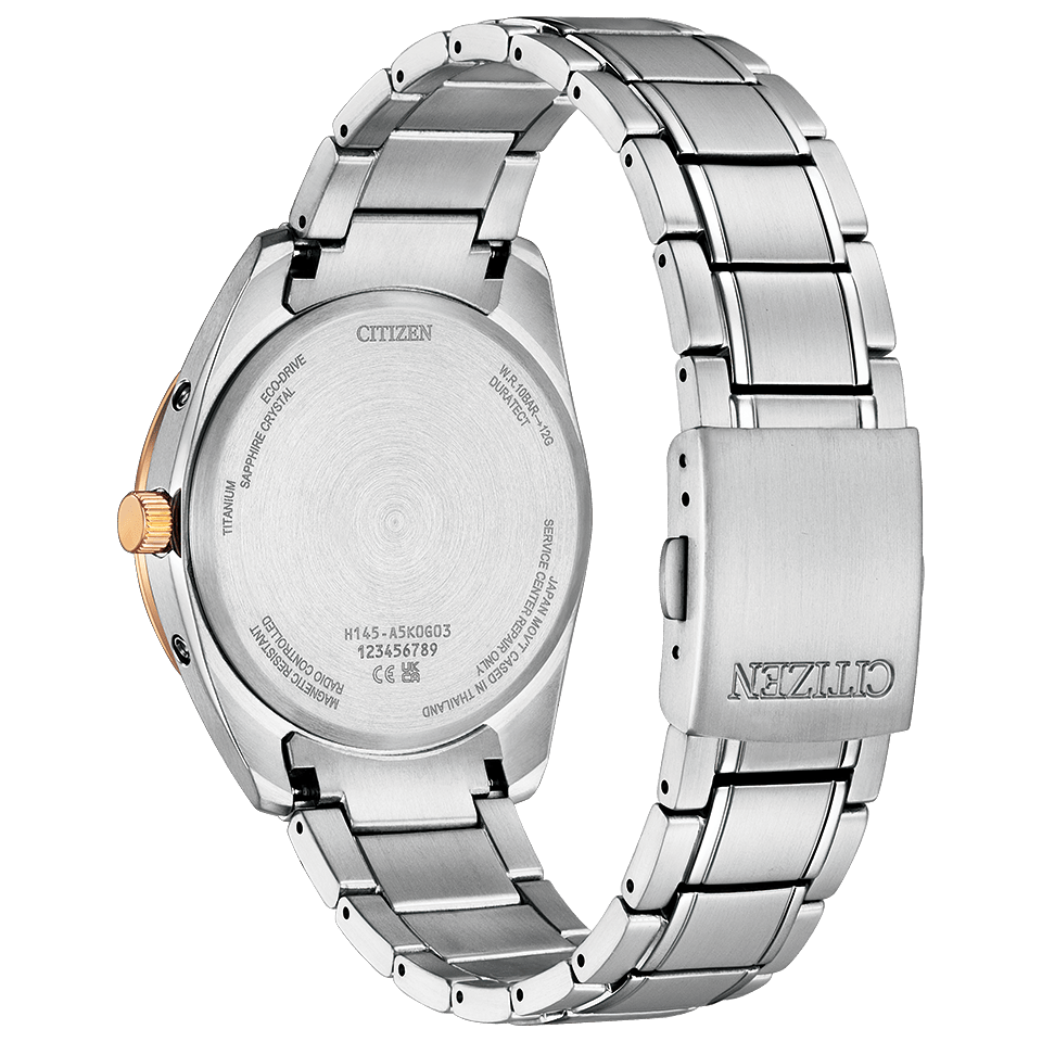 CITIZEN COLLECTIONでは唯一、ケースとバンドにスーパーチタニウム™を採用した、ベーシックな3針モデルをアレンジ。ピンクゴールドのベゼルを合わせたツートン仕様で、普段使いしやすい色合いの中に華やかさと限定感をプラスしました。インデックスと針はベゼルに合わせたカラー、文字板にはピンクのラメを入れることで、柔らかな輝きと上品な印象を与えます。